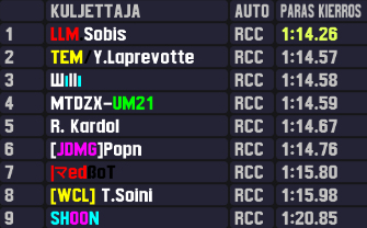 2nd place goes to UM21. Setup was slower than Sobis' set, and laptimes were nearly 1 second slower each. Only drafting could bring him to go sub 1:15. The fear of suspension wearing off was high for him, but no repairs needed. Due the mistakes by other racers, 2nd place is for sure good place to finish.