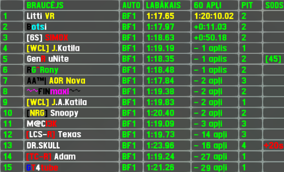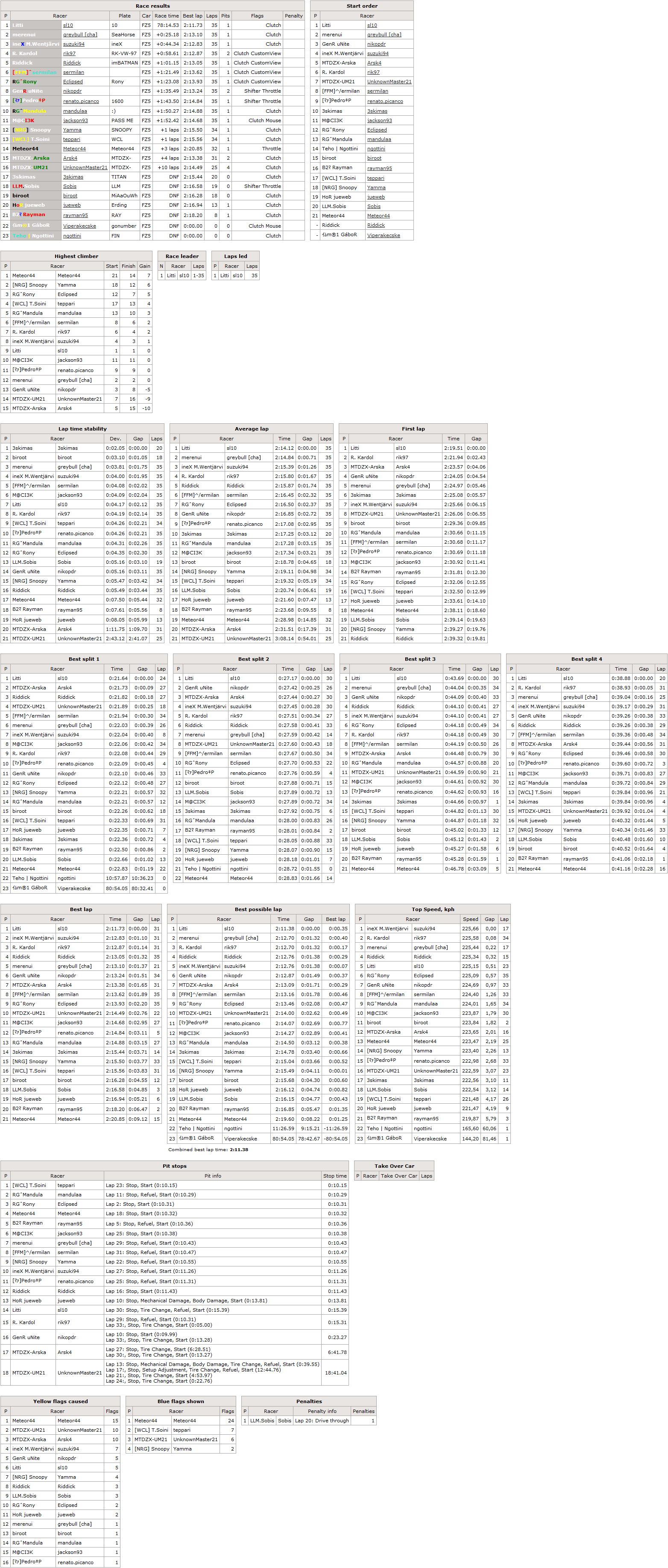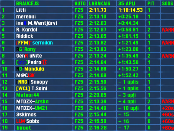 After recent success in normal RTFR,Litti made a debuth also in XL version and that with style - he set a lap more than a second faster than the competition in both sessions and was never challenged for win as he led every meter of the 180 kilometer race. After 16 races break the 6th most successful driver of RTFR XL made a return to the event under new name and flag. Merenui carried over his qualifying position to finish line and added 2nd place finish to his 2 race wins to make a total of 4 top5 finishes. Another finnish first time participant M.Wentjärvi finished 3rd. Only other previous winner R.Kardol finished 4th,which is his 8th top5 finish (tied 3rd most),Riddick started from back of the grid and still joined the top5 finishers list for the 2nd time.