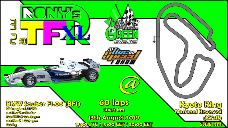 4 weeks gap between XL races as always and the combo for next one has been already submitted. It will be the 3rd race in row where a previously unused car will be used,this time the fastest LFS car BF1. The selected track is Kyoto National Reversed,which is a great variation of speed and cornering. Already next tuesday the normal RTFR returns,one of the road legal cars will be used,more details tomorrow!