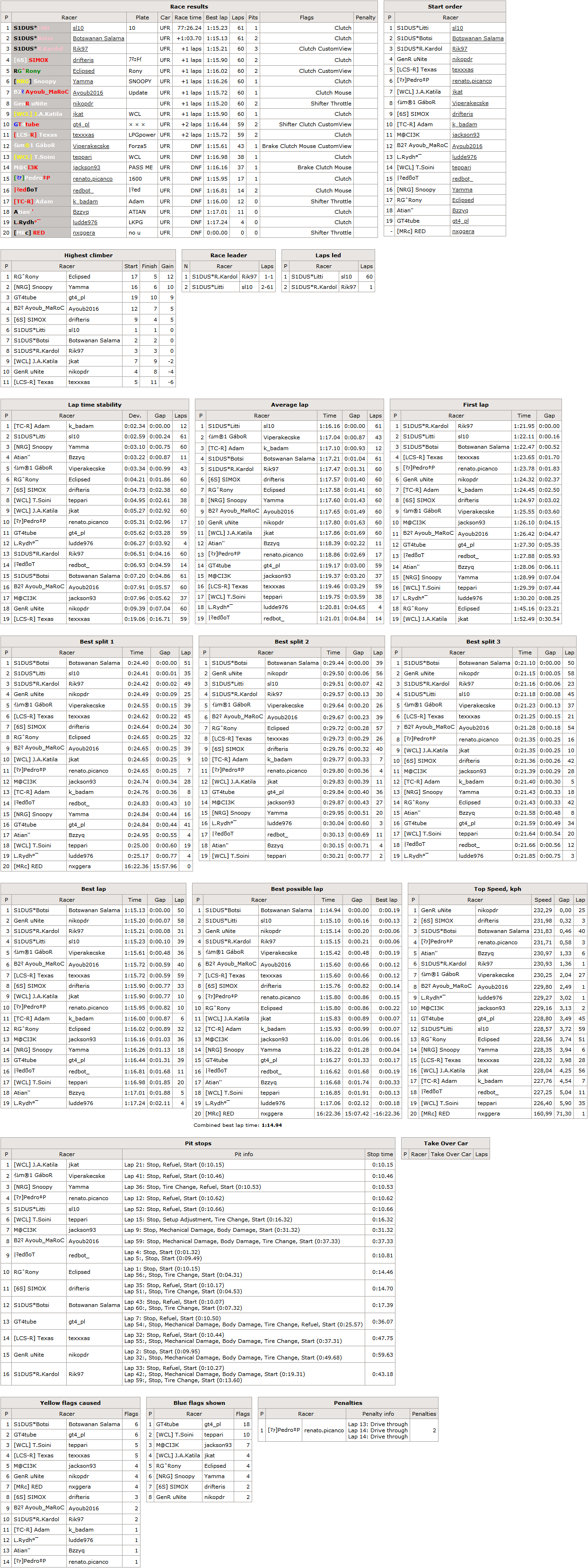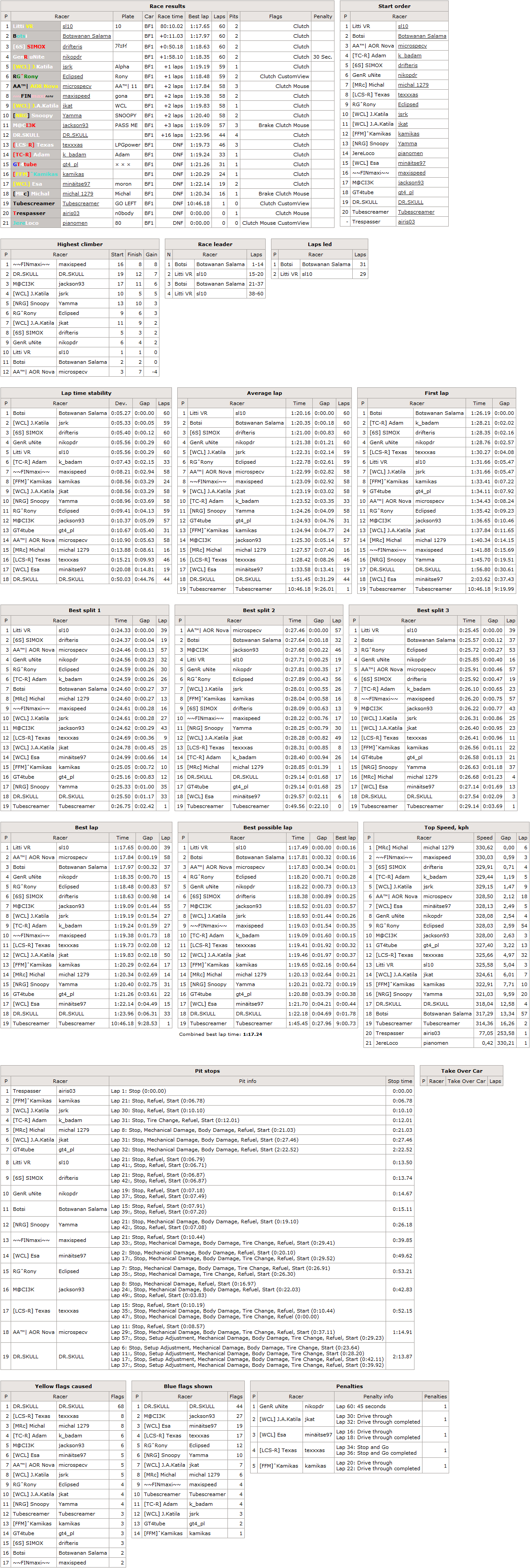 LLM.Sobis - receives 60 seconds penalty added to his finish time for not completing pitstop requirement.