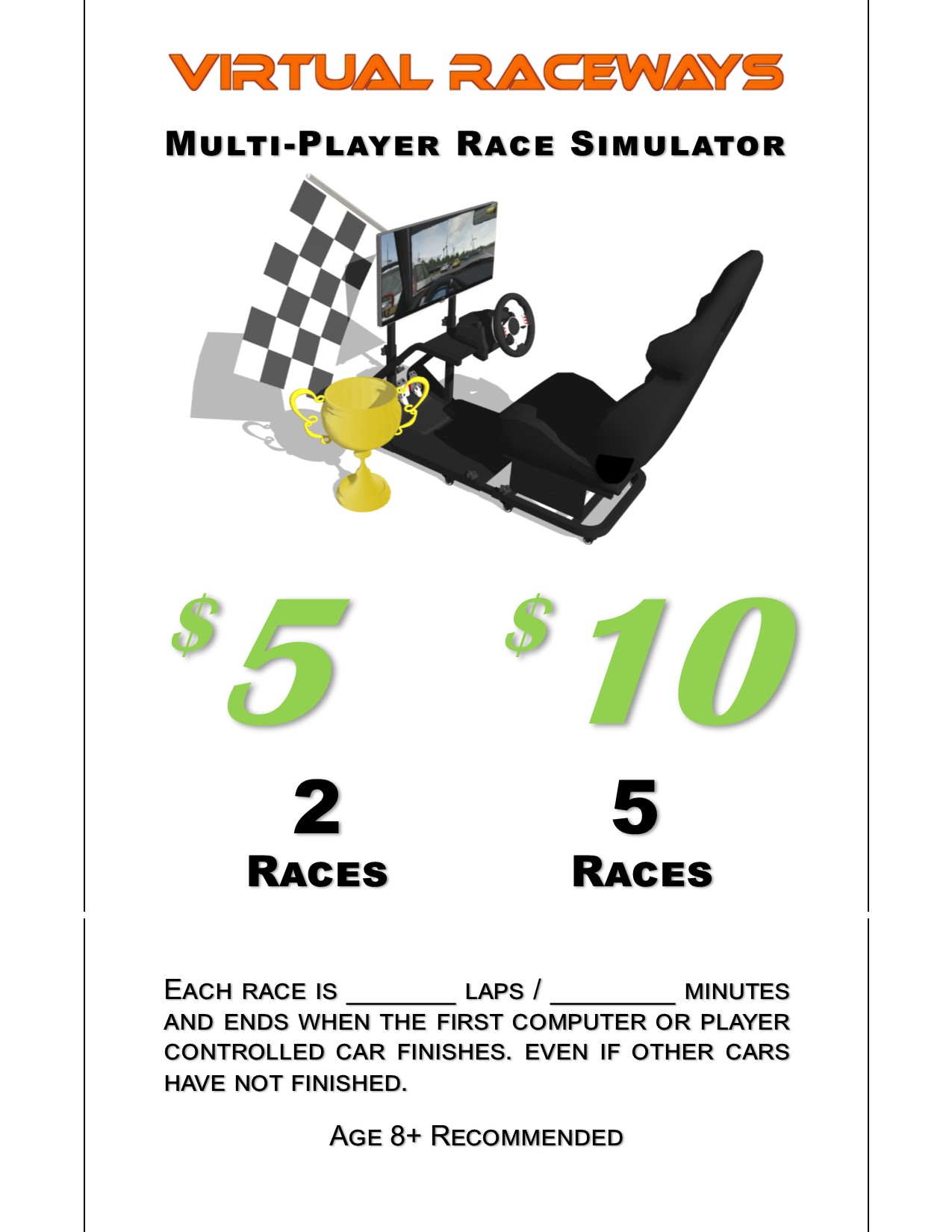 I will be doing another fairly large event next weekend, this will likely be the first time I charge per-race. I was going to charge $5.00 for a 10 minute race, but I think I am going to change gears, and charge $10 for a 20 minutes of racing, divided up into 5 separate 3 lap races. This way if they crash early or screw up it is not too long until they can restart at the start line. It is surprising how few people can get OUT of the pit and onto the track......... without pretty much doing it for them.