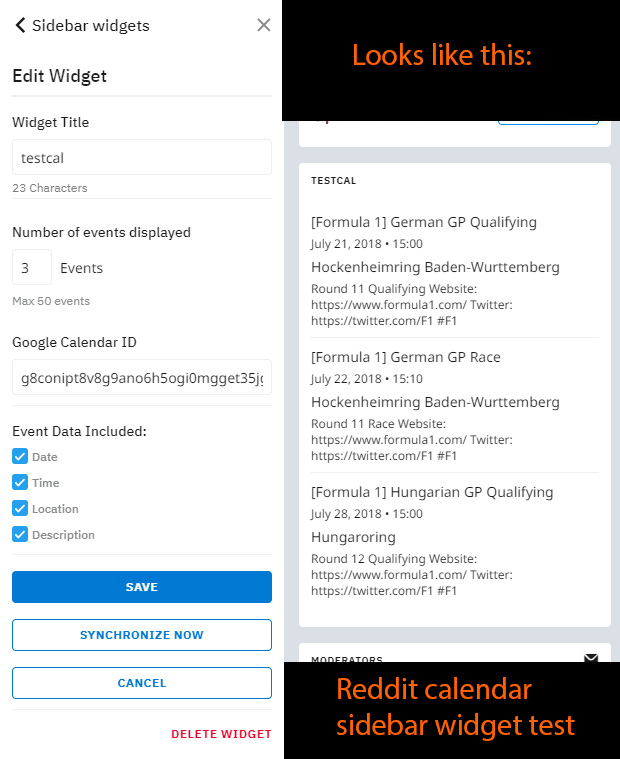 . I was wondering if there's a way to get an always synchronised and up-to-date feed of the Racing Calendar here: https://www.lfs.net/leagues/calendar . The idea came from browsing the features of the moderator interface of the new Reddit (to be exact, I was managing /r/LiveforSpeed). It is now possible to add sidebar widgets, and one of the types is Calendar. Thought it would be cool to show the upcoming events on the sidebar, so more players could see them. It could retrieve the fresh data from LFS.net. This Reddit widget only supports Google Calendar ID, though (for example [email protected] - this one is a motorsports calendar for the rest of the year).