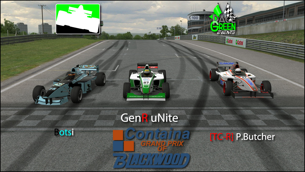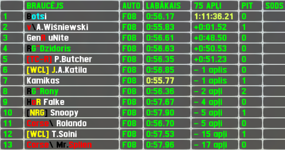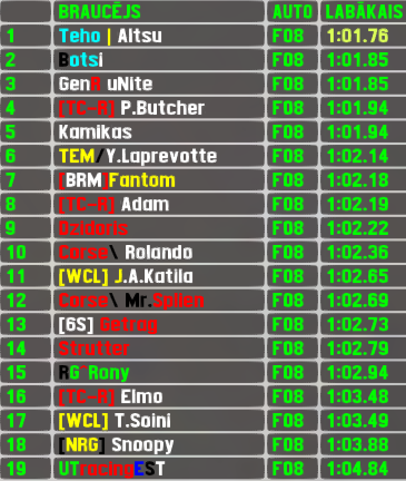 In front of the field this was a race of ups and downs - everyone of the podium finishers led laps and everyone of them lost the lead due something,either being passed,making mistake or getting involved into incident. First incident happened very early - polesitter Altsu slipped sideways exiting turn one and hit the other front row starter Botsi to make way for rest of the field. Altsu decided to retire after this,but Botsi carried on and started the big chase. Unite used the chance to slip in lead after this incident and led first 10 laps before getting passed by P.Butcher on the back stretch by slipstream pass. P.Butcher led 32 next laps,but made a mistake and spun due hitting patch of grass just before 2nd split - he was lucky to recover quickly and without other damage than lost lead. Unite led another 6 laps,but then picked the wrong side to drive around from earlier incident recovering car,allowing P.Butcher to regain the lead,but not for long - Botsi was back at front after rally through the whole field and made a pass for the lead in turn 1. After such performance from Botsi most would think the race is decided,but Botsi run wide in exit of last turn in 53rd lap,allowing Unite to slip by,who had the pace to hold on to the lead until finish,deciding the eventful race for himself. Botsi could not set up for a pass during last 9 laps and finished just 6 tenths of a second behind,P.Butcher could not keep up with the two finns in late stage,finishing 3rd 7 seconds behind winner.