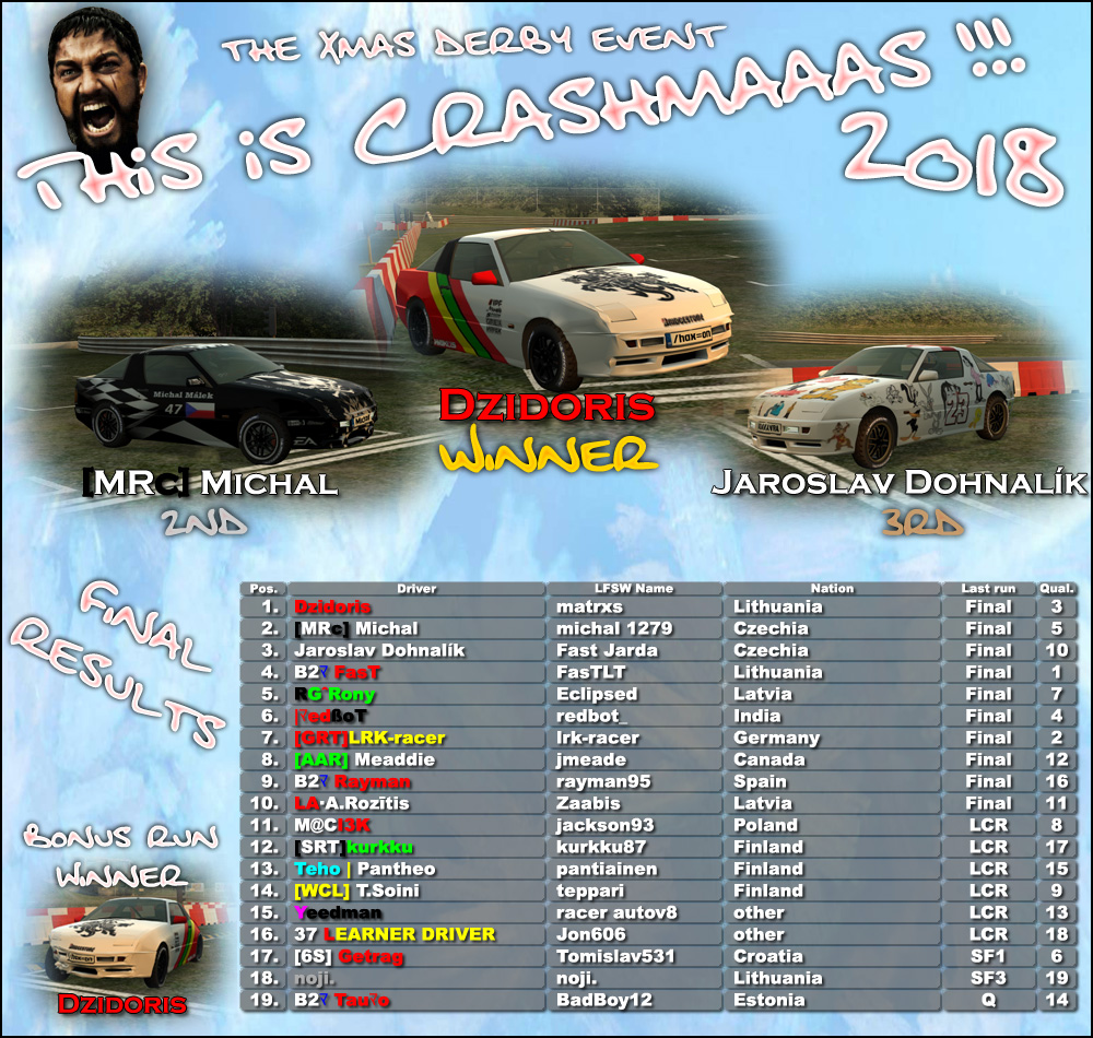 It's the ultimate carnage - everyone in server will be able to take part in this 20 lap run,the best part - starting order will be random,so you could only blame LFS randomizer for a bad starting position. As usually bonus run will have some new layout additions,some a bit experimental,some pretty much classic,some might put you out of race,some will help you to put others out.