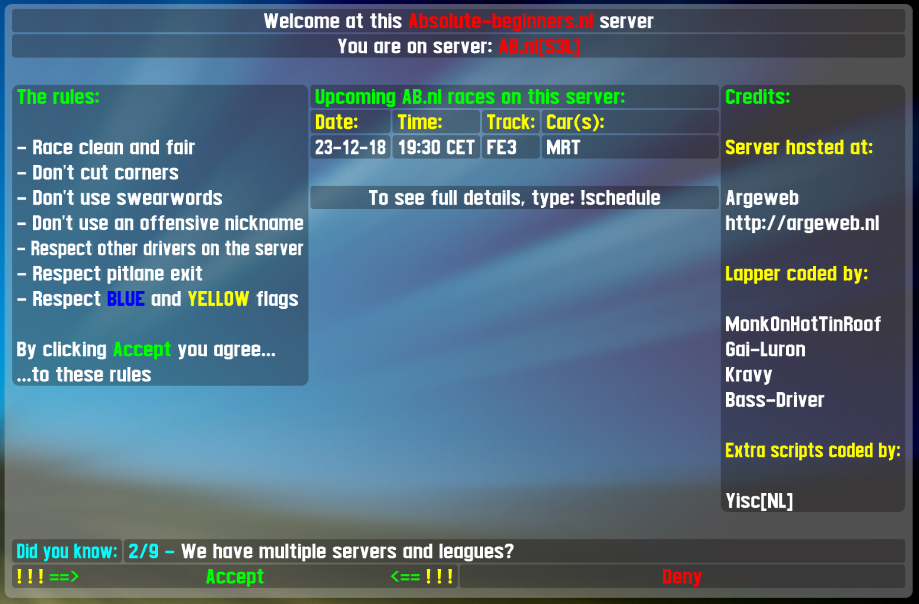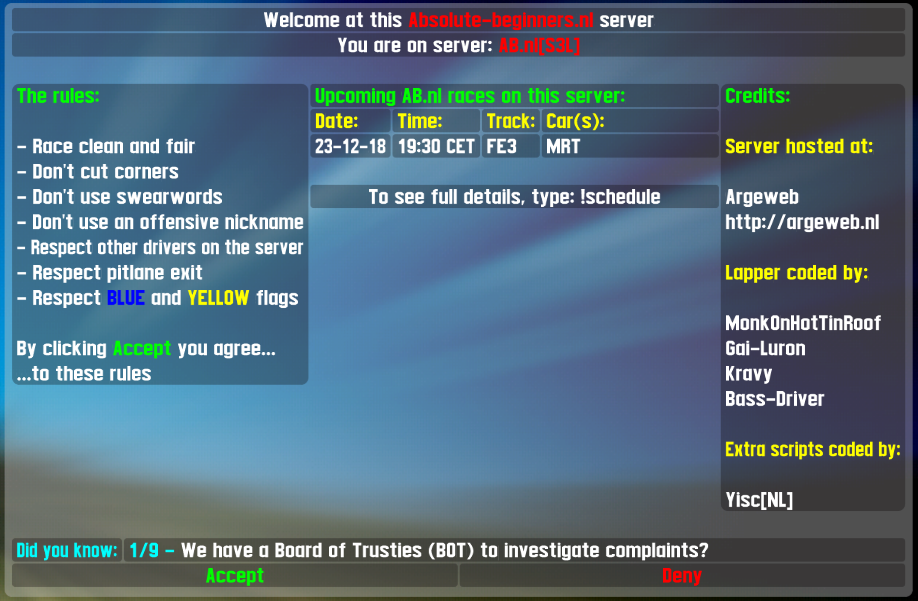 Quote from Yisc[NL] :Just for your inspiration (or for the inspiration of others) a few screenshots of the Welcome screen I made for our AB.nl servers.