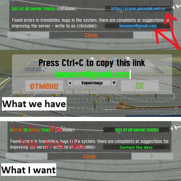 Example, I have a button "contact the developer/server website" and my email/http adress in field for quick text copy. But I don’t need the same text to appear on the button itself, I would like the ButtonText and FieldText to be separate, continue the implementation as \0ButtonText\0Caption\0FieldText. There is no need to increase the max length of the BTT>Text.