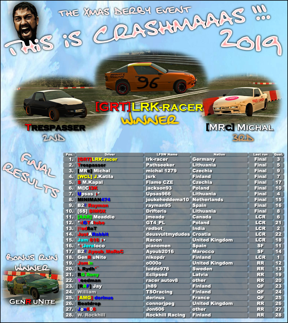 As always there were some drivers joining randomly and few who had no clue about event format (luckily most of them were still behaving with joining),but with exeption of 2 penalties and organizer switching 2 drivers in QF results,the event went relativelly well. There is still a wish from organisation side to revive the MayDay MayHam in 1st may (this year it would fall in friday),but there are no promises about event actually happening. Otherwise we can wonder if this was the final run in the old Bullring or will there be another one? There aren't that much tracks to update anymore,but we haven't seen anything how the Fern Bay will look like after the big update. But - 26th december 2020 will be the date of the decade event of "This is Crashmaaas !!!",we just don't know where exactly it will take place.