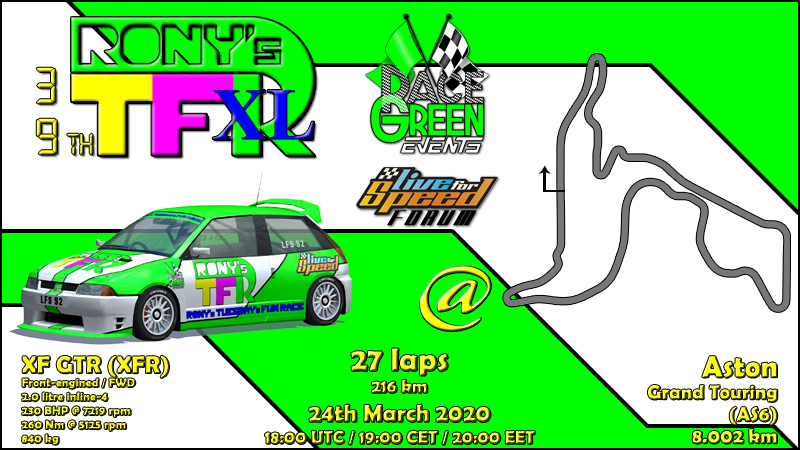 Again 4 weeks break until next RTFR XL - the winner has already submitted combo for the 40th RTFR XL and it will be the 1st custom track for almost a year - Fern Bay Island (Fern Bay Gold with an extension over part where FE2R has it's famous 1st chicane). Car used for this track will be XRG - as always in case of custom track in the week after next normal RTFR server will be set up with this combo for laptime testing. Next tuesday street legal cars will be featured in next RTFR,more details in the weekend. Next week Race Green Events will host a very different endurance race - 300km of Westhill. If interested,all the info can be found in event's thread: https://www.lfs.net/forum/thread/94016