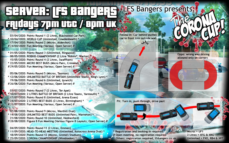 To keep us all occupied and at least half-sane during these crazy times, the recently deceased LFS Bangers league has been resurrected for an until-further-notice series of Fun Nights to be held on LFS Bangers and PiranMOTODestructionDerby!