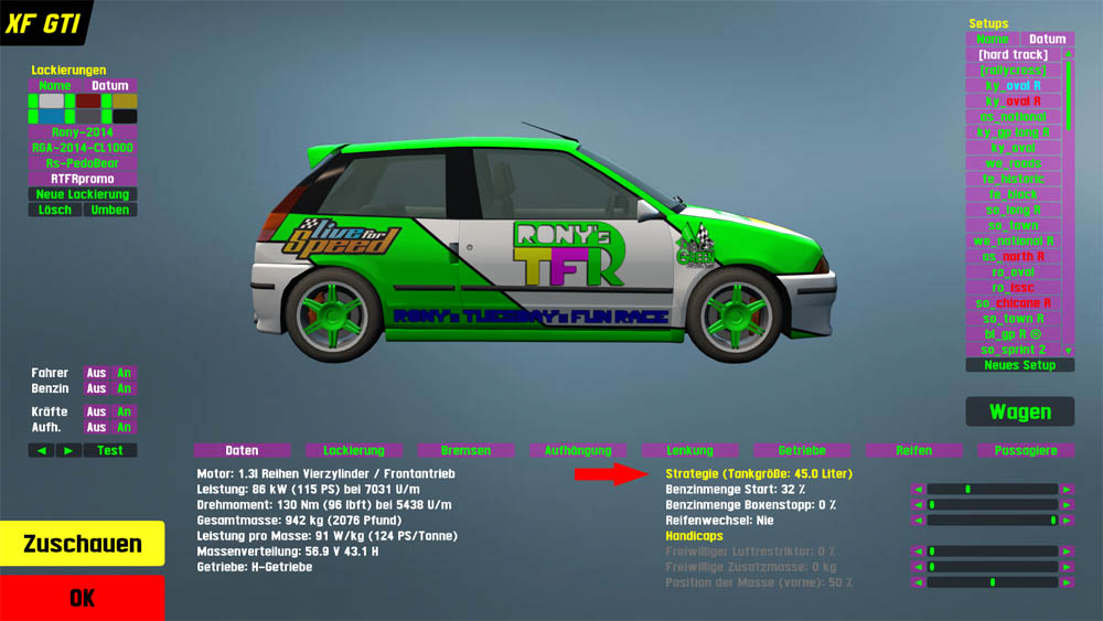 I just want to find out the fuel tank sizes of the different cars. GTR in particular. I just want to find out how many weight / liter is carried in a 100% full tank.