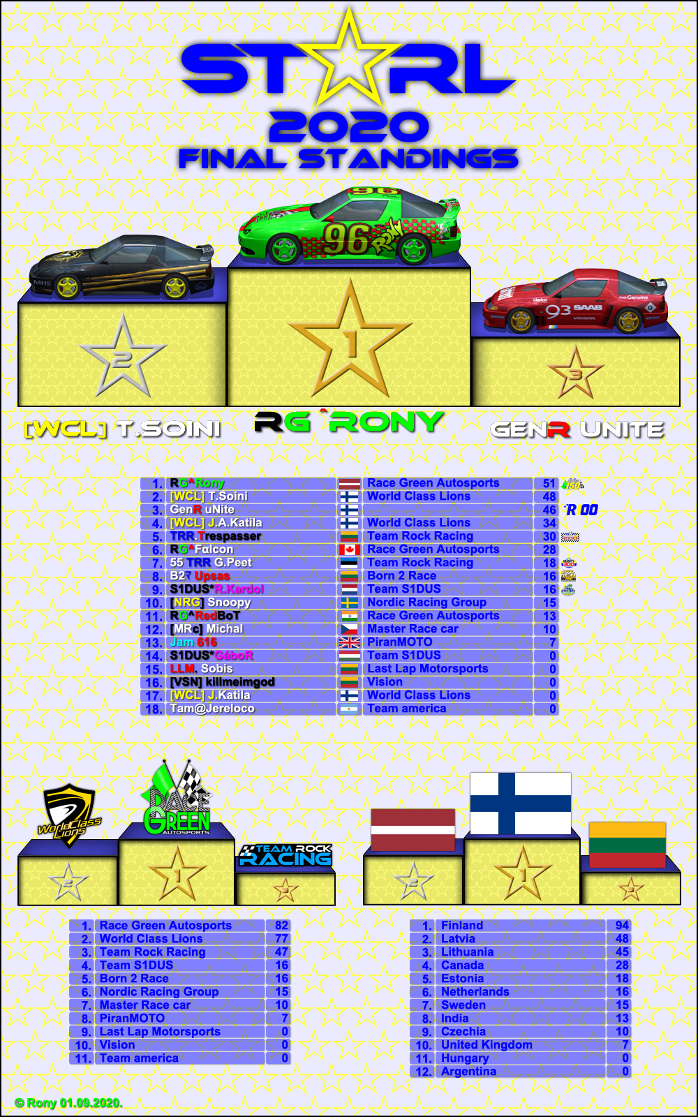 STARL Teams Champion - awarded to a team with the most points scored through all 6 rounds (team will score finishing points from it's 2 highest finished drivers and all round bonus points)