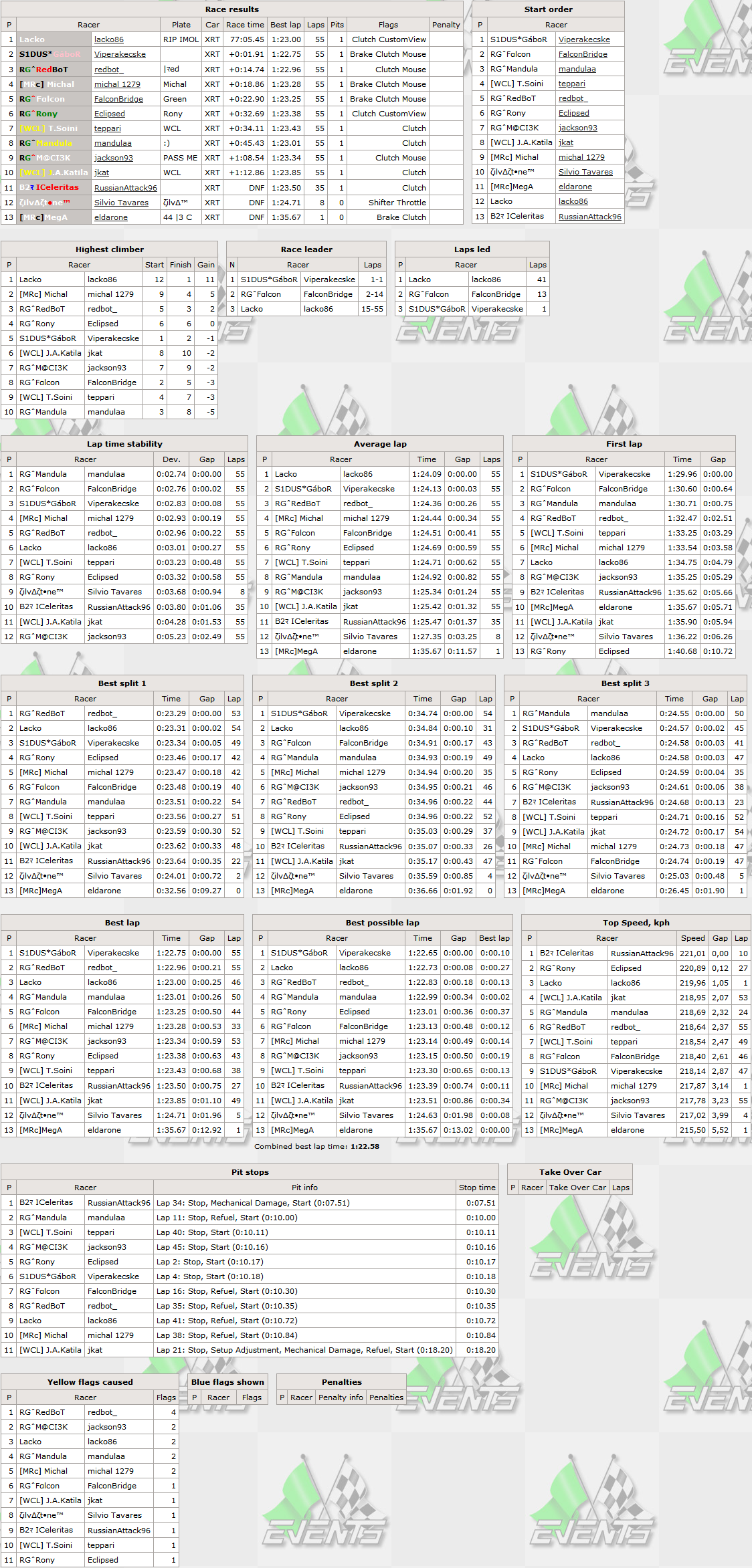 After 4 successive events where the combo picker did not arrive,it looked like this will be the 5th one,but after qualifying Lacko broke this streak and used the rule which allows previous winners join the race as long there are free grid spots - and he used this chance well to climb up the standings and keep the gained lead also after his late pitstop. With this performance Lacko joins the winning streak club - he is the 7th driver,who has won back to back RTFR XL races,increasing the total of his wins to 3 and of his top5 finishes to 5. His countryman Gábor set the fastest lap in both sessions (both are his 1st),but could only repeat his best finish and only top5 finish 2nd - but he also clocked the 4th closest finish in RTFR XL races. Just like Gábor,Redbot was also able to set faster lap in race than the winner,but finished just 3rd,which is his 3rd top5 finish,Michal finished 4th scoring his 4th top5 finish and the leader of 13 laps earlier in race Falcon finished 5th which is his 3rd top5 finish.