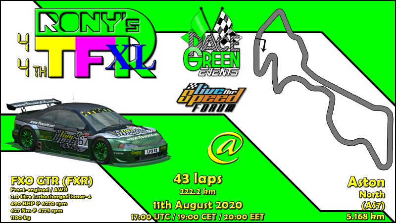 With usual 4 weeks gap the next RTFR XL will come with the slowest car of LFS - UF1,the venue for this race will be South City's longest standard configuration with according name City Long,it will be a 34 lap race at this combo. But already next week the next normal RTFR is scheduled using one of the street legal cars,more details will be posted this weekend.