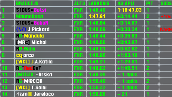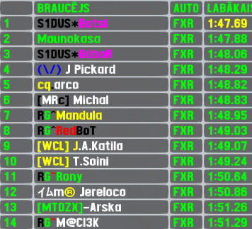 For 2nd race in row there were 3 different leaders,but unlike last time,the driver with most lead laps did not won this race - Botsi led just 1/3 of the race,including the most important lap - the last one. Despite losing lead already on 1st lap,the polesitter kept stable pace and planned his pitstop strategy well to score his 9th RTFR XL racewin (it was also his 9th pole position) and 12th top5 finish. The first time participant Maunokasa started from 2nd position,slipped early in the lead and even set the fastest lap of the race,but miscalculated his fuel strategy which led to 2nd pitstop,causing loss of safe racewin - 2nd position in final results,despite earning penalty on his 2nd pistop. Gábor started and finished 3rd,earning his 3rd top5 finish,J.Pickard was the 3rd driver besides 2 leaders to lead a lap in this race,but finished just 4th,which is his 2nd top5 finish. 5th place finisher Mandula is the only top5 driver to finish in other position he qualified in - he gained 2 positions during the race and scored his 2nd top5 finish.