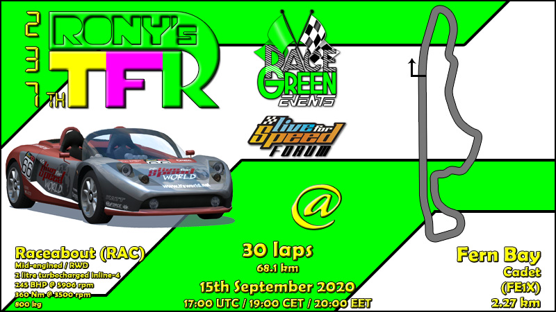 Next week RTFR will take a break,while server is set up for laptime testing for next RTFR XL (more info in RTFR XL info thread),but in tuesday in two weeks RTFR will return with one of the slick tyre cars. But Race Green Events' action is not over this week as V8 Racing League will start it's 6th season this sunday,if interested in racing a challenging single seater car,check the VERL forum section for more info and signups!