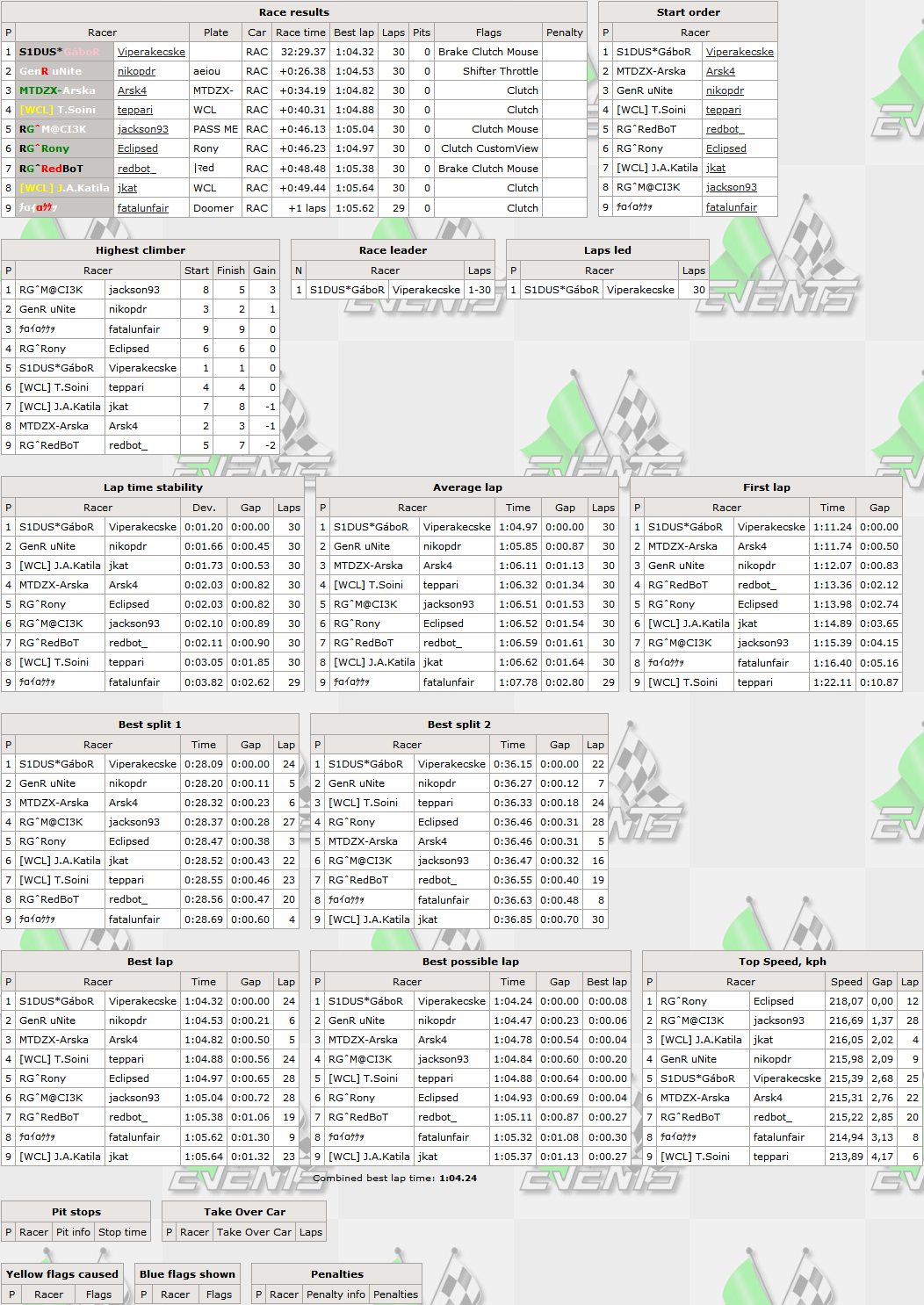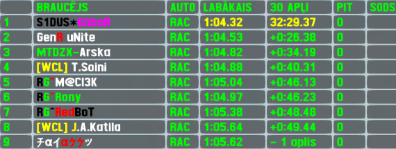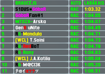 Gábor did not had much competition in this event - he set a new track record during qualifying and was the only one to break the 1:04 mark,he dominated also the race by leading every single meter,setting his 1st ever fastest lap of the race in RTFR races - his win is already his 3rd,pole position - his 2nd effort,he also scored his 9th top5 finish. Early in the race the leading trio seperated from the rest,but later also 2 other leaders lost ground to Gábor - Unite managed to pass his countryman for 2nd position and kept it until finish line,scoring his 27th top5 finish,another previous race winner Arska finished 3rd and earned his 7th top5 finish. T.Soini regained earlier lost positions and climbed back to his starting position - 4th,which is his 18th top5 finish,ending a long top5-dry streak since 204th RTFR. Maciek won the battle for remaining top5 spot and also ended a long dry streak (since 206th RTFR) - 5th top5 finish in total for him.