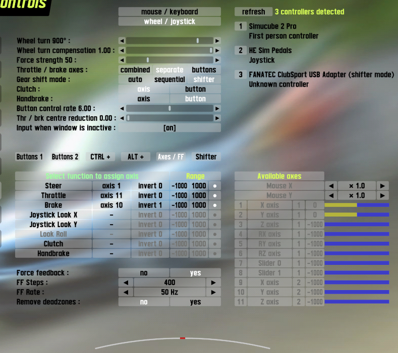 I've tried to set the axes by selecting each controller individually but I haven't been able to deselect/deactivate the wheel Y axis (defaults to "middle" 50% joystick value) as it's tied to the pedal axes where the y axis controls the brake.