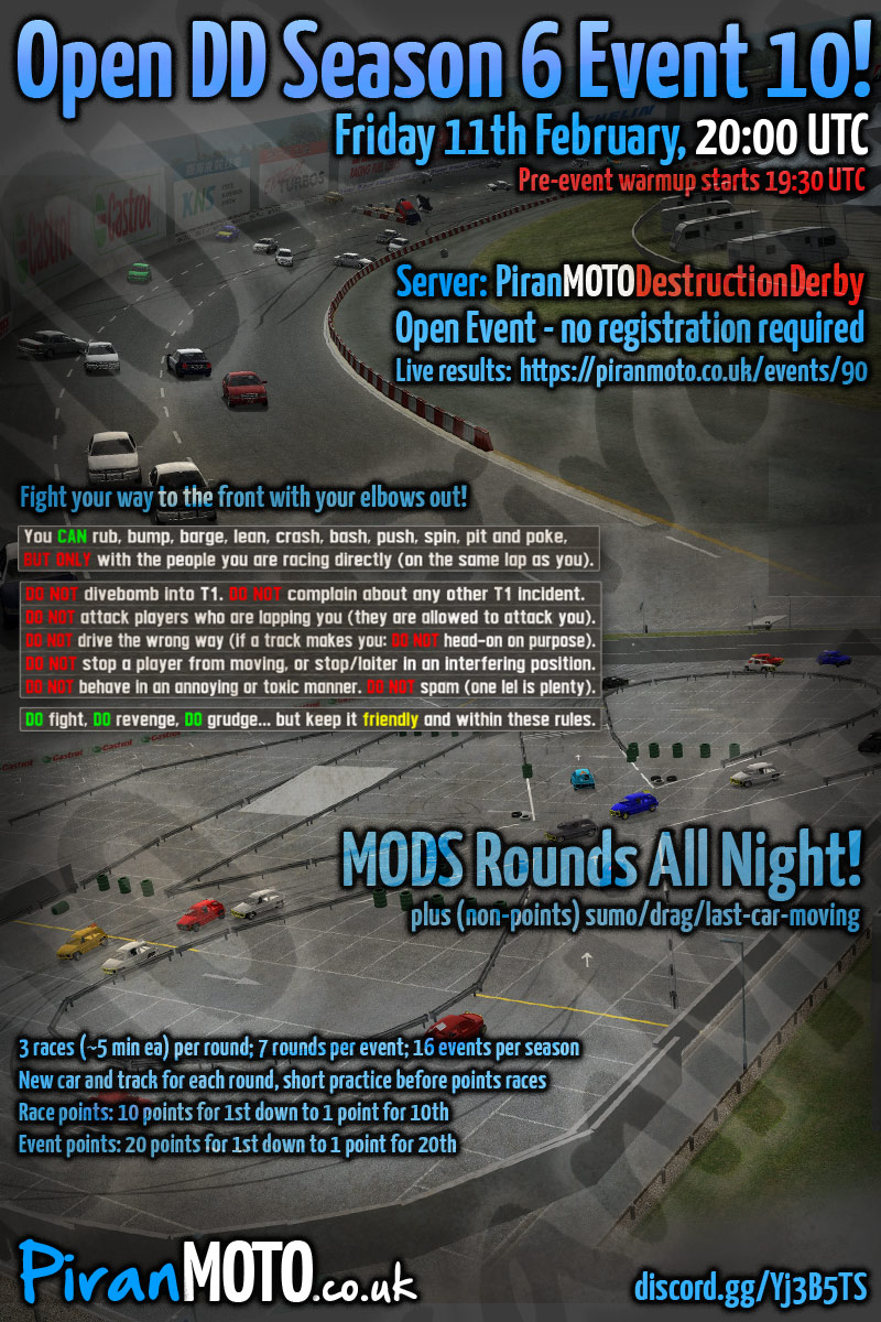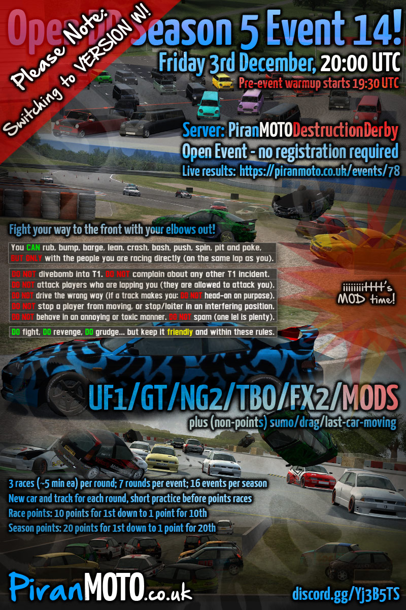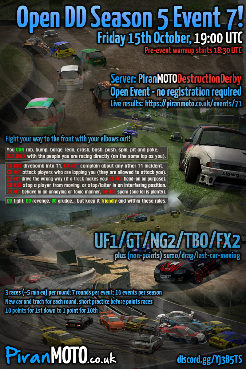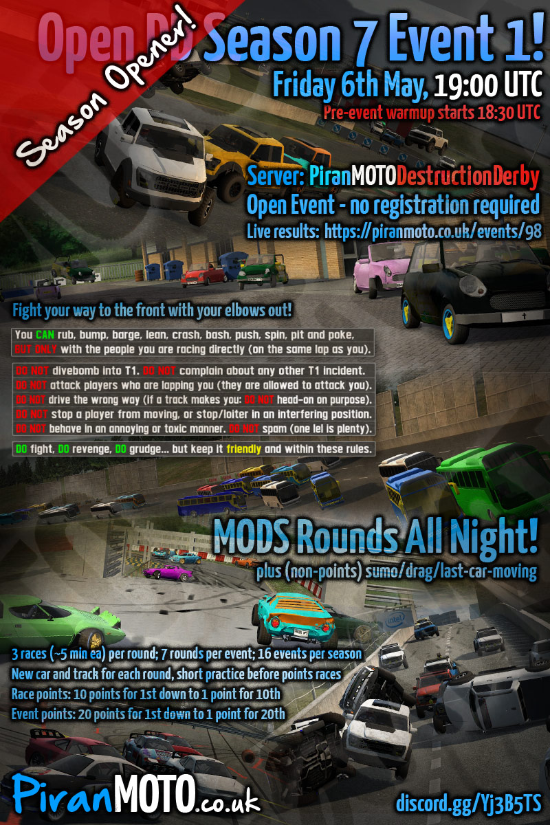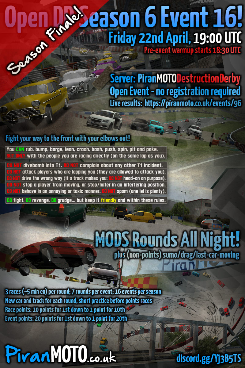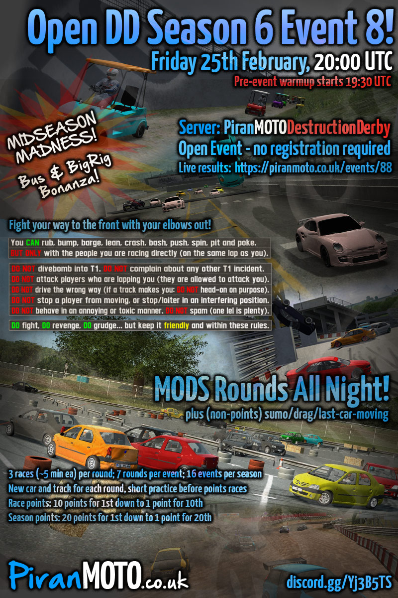 Hi all, the 6th season of PiranMOTODestructionDerby Open DD events will start in 2 weeks - Friday 7th January.