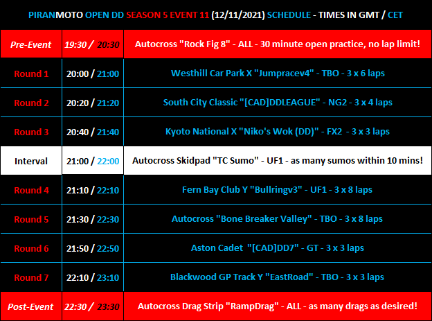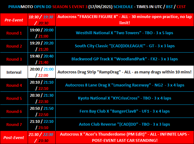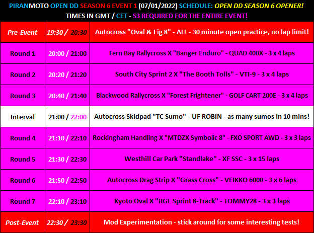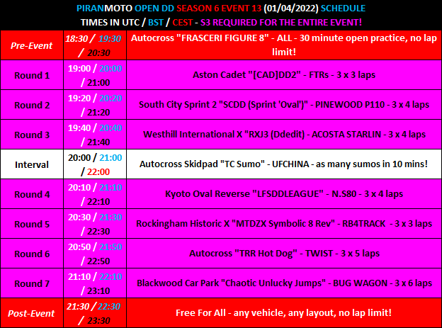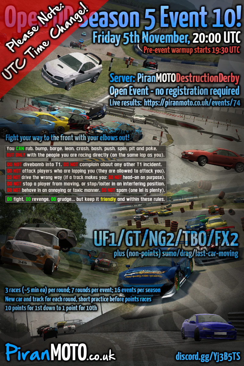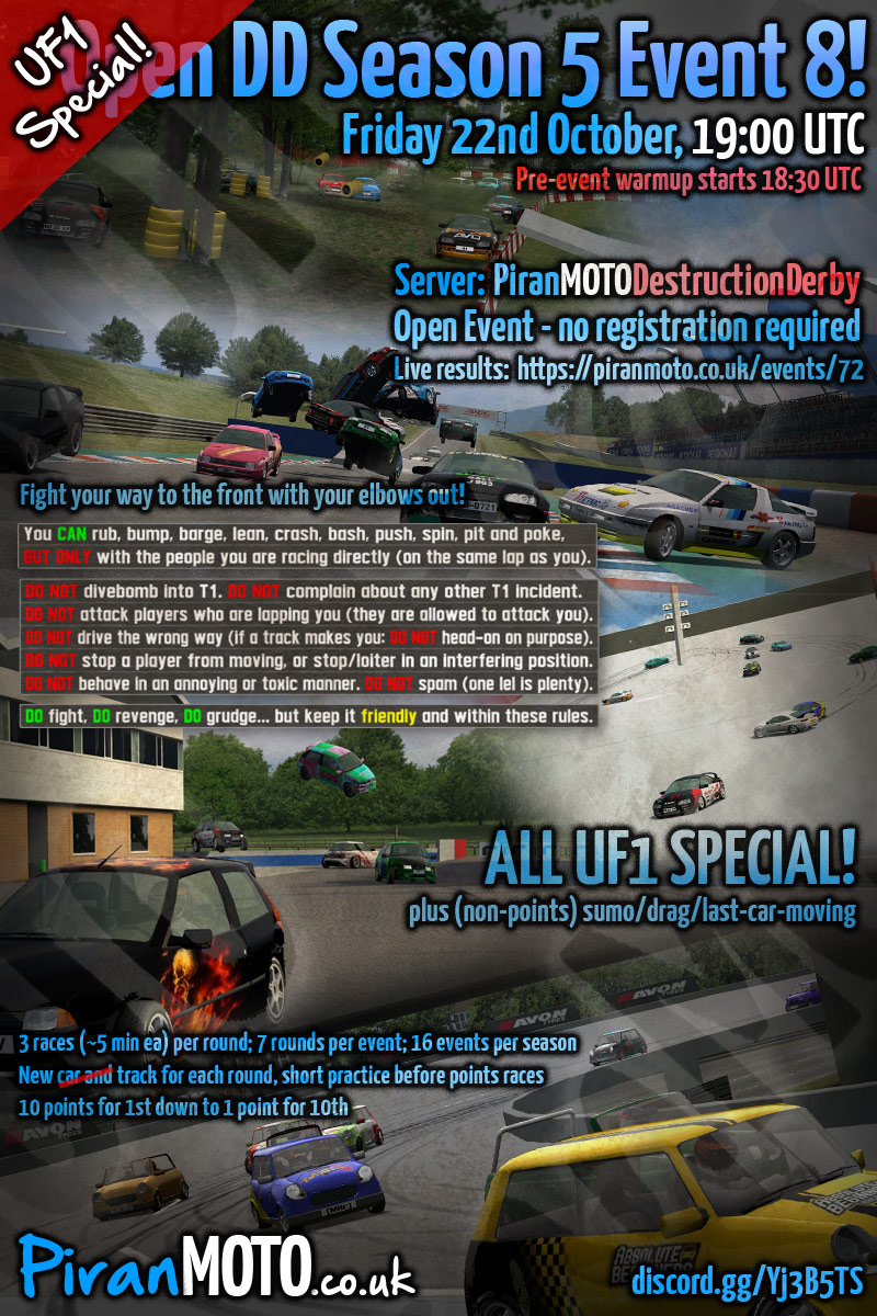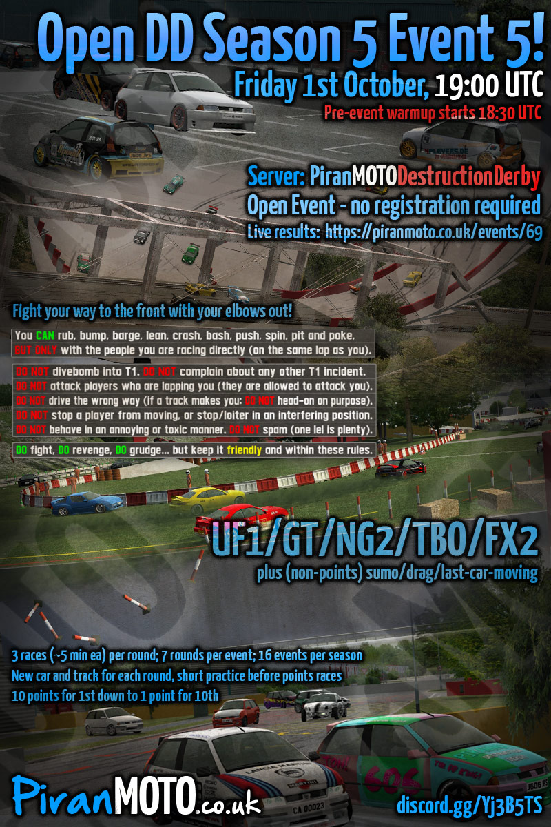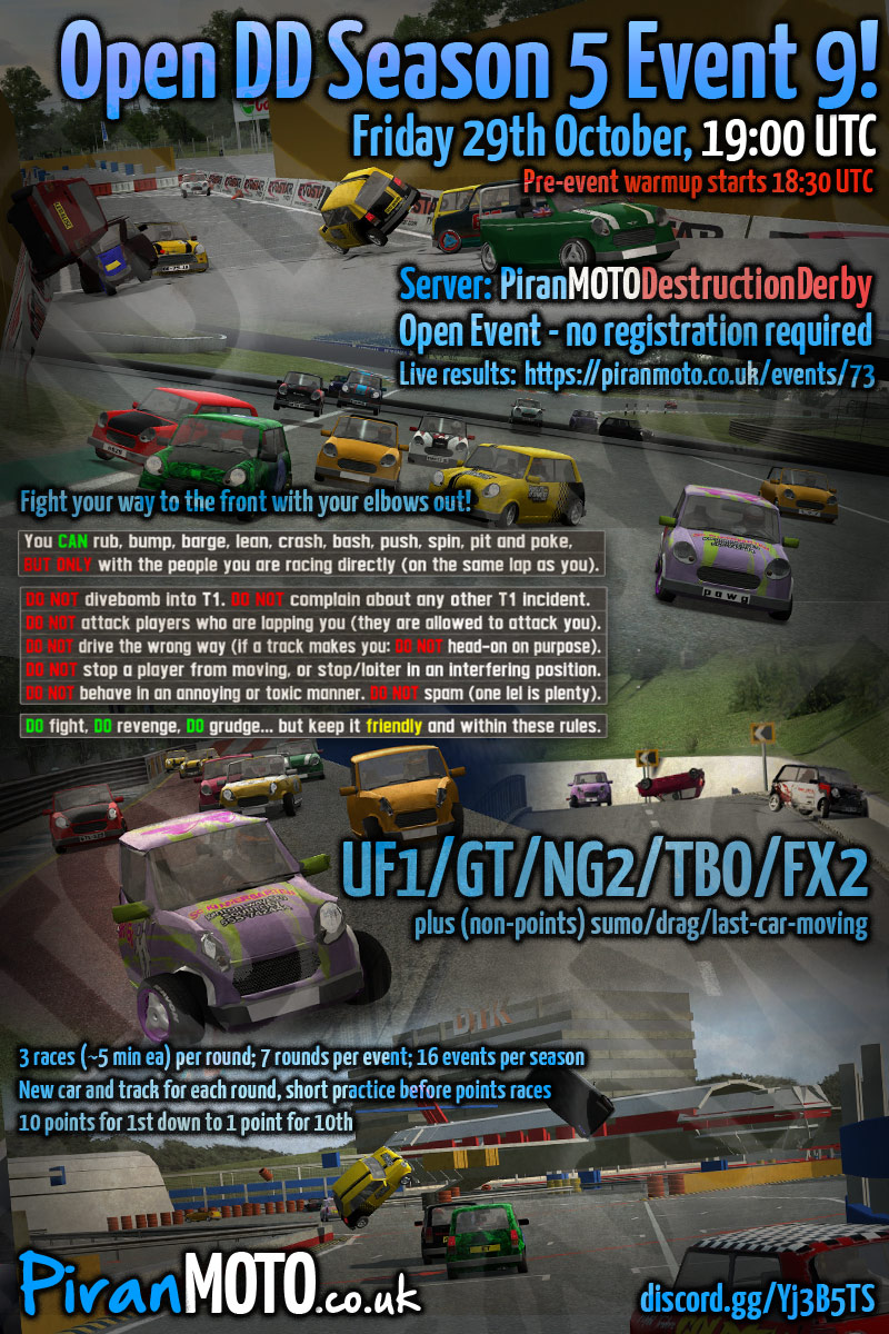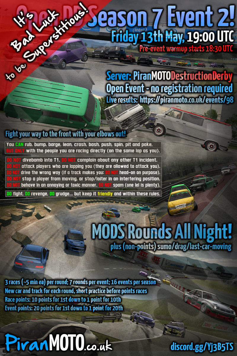 Hi all, the 6th season of PiranMOTODestructionDerby Open DD events will start in 2 weeks - Friday 7th January.