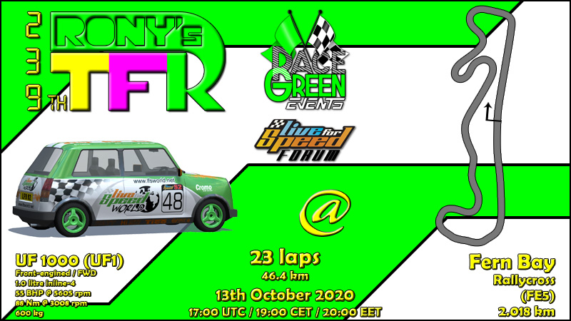 Almost 50 races have been done since the last RTFR on a rallycross track and also it was 1st ever race in Fern Bay's longer rallycross configuration in normal RTFR history (there was a race on this track in RTFR XL). Car for this event was the 3rd most popular in RTFR history - UF1 and attendance almost reached the average of this car.