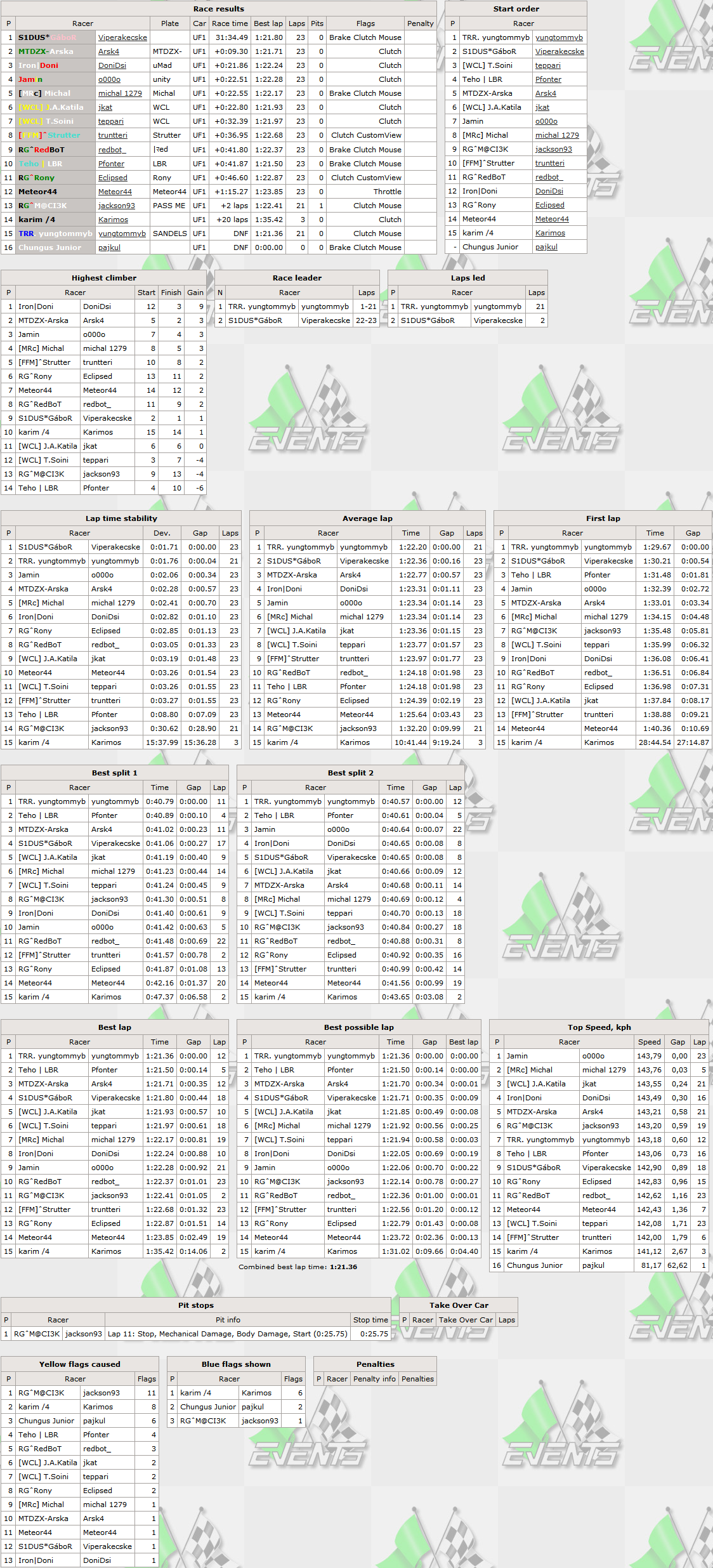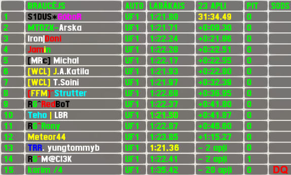 Already before event start in practice Yungtommyb set a server record for this configuration,claiming his rights for a good result in this race - he did score his 1st pole position and 1st fastest lap of the race here,but run out of fuel with less than 2 laps to go and gave up the chance for 2nd race win. Second best on track was Gábor and he used the chance given to him to score the 4th race win in RTFR,which is also 10th for Hungary,while it was also his 11th top5 finish. Arska was the only other previous winner in this race's top5 and he finished 2nd,8th top5 finish for him. First time participant Doni finished 3rd,Jamin finished 4th,which is his best finishing result in RTFR,improving previous best by 2 positions,but Michal finished 5th - 8th top5 finish for him,2nd in row.