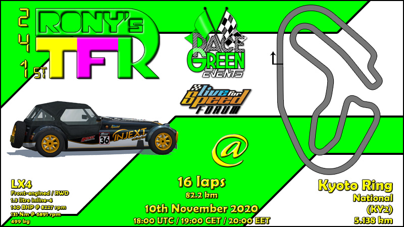 Race Green Events now is in 2 weeks vacation as next tuesday is the free one and VERL season has already ended. After this break action will return with one of the slick tyre cars,which will be penultimate race in the 2020 standings,but week later the RTFR XL 2020 season will end with final race featuring LX6 at Rockingham's ISSC Long configuration.