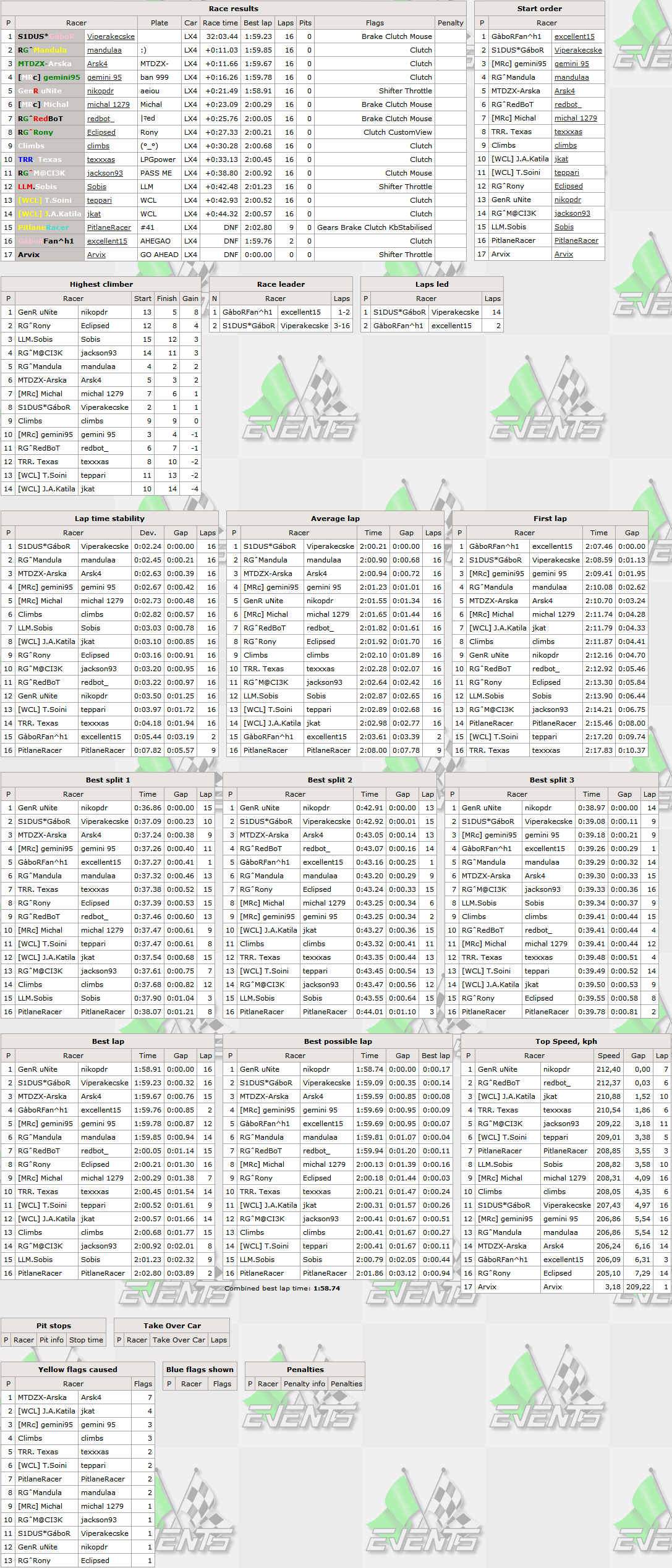 A previous RTFR race winner under name of GaborFan joined this event and marginally set the fastest lap in qualifying,scoring his 2nd pole position,but during the race his connection was very unstable and he was spectated for safety/distractional reasons - despite being ahead of field,he kept lagging,causing unnecessary distraction to followers. Gábor was 2nd fastest at that point and took the race lead,which he never gave up,finishing 11 seconds ahead of closest rival - with this Gábor scored his 5th racewin in RTFR,moving himself 3 positions up to 18th position in all time success ranking,and scoring his 13th top5 finish. Winner's countryman Mandula finished 2nd,which is his best ever RTFR finish - improvement by 1 position,also 13th top5 finish for him. Remaining drivers in top 5 are all finns - best of them was Arska in 3rd position,9th top5 finish for another previous RTFR race winner in the field. Gemini qualified and finished in same position - 4th,in qualifying it was his best ever result,in race just a repeat of best,2nd top5 finish. Unite finished 5th,scoring his 28th top5 finish and in final lap he even stole the fastest lap of the race,which is his 10th already.