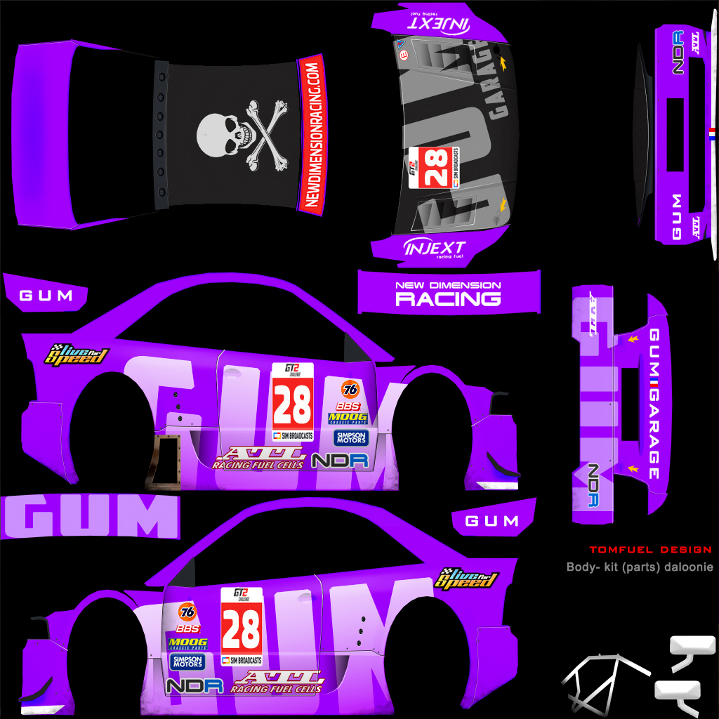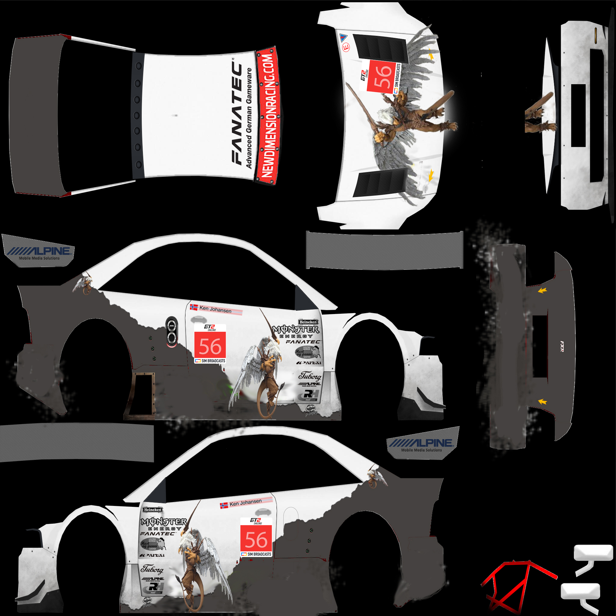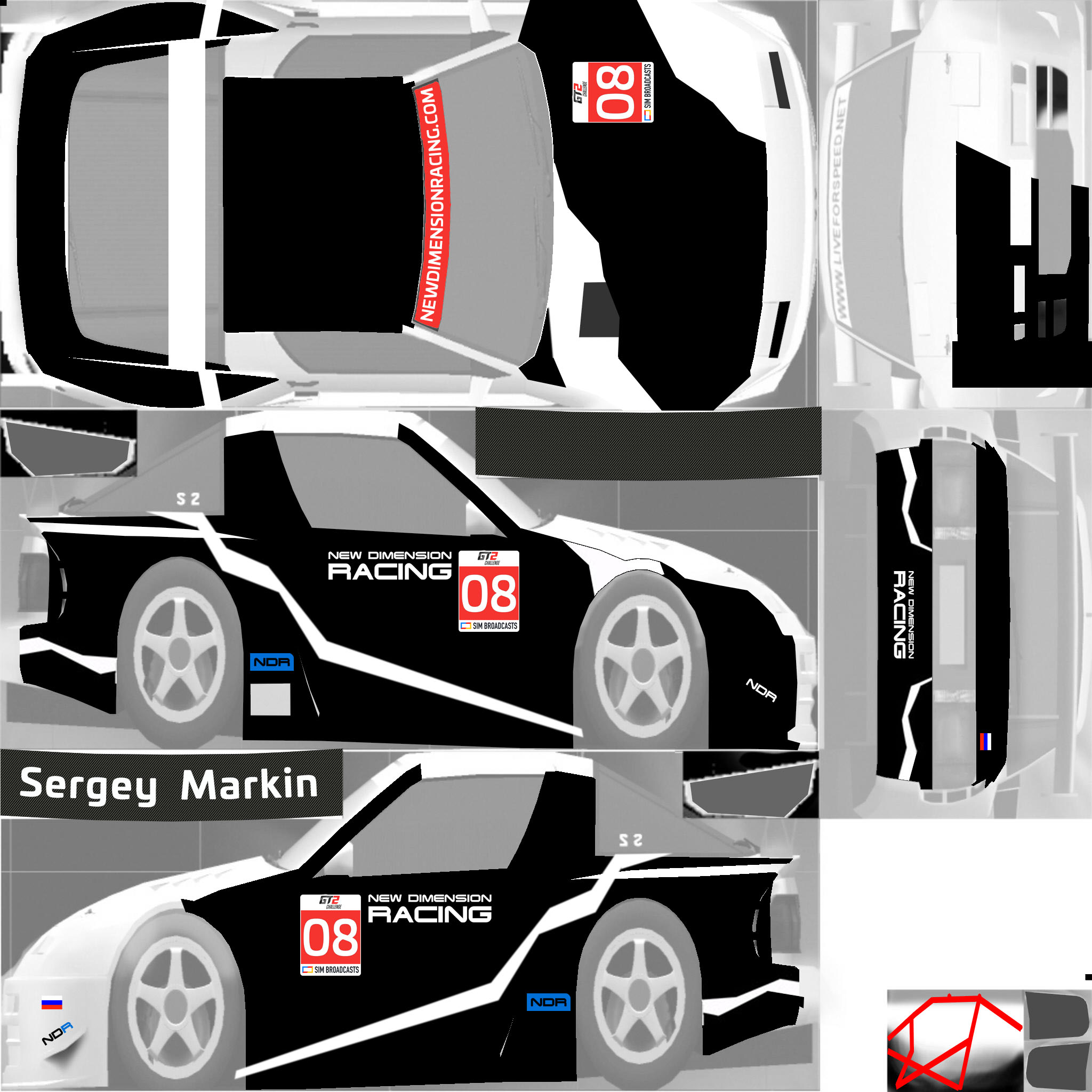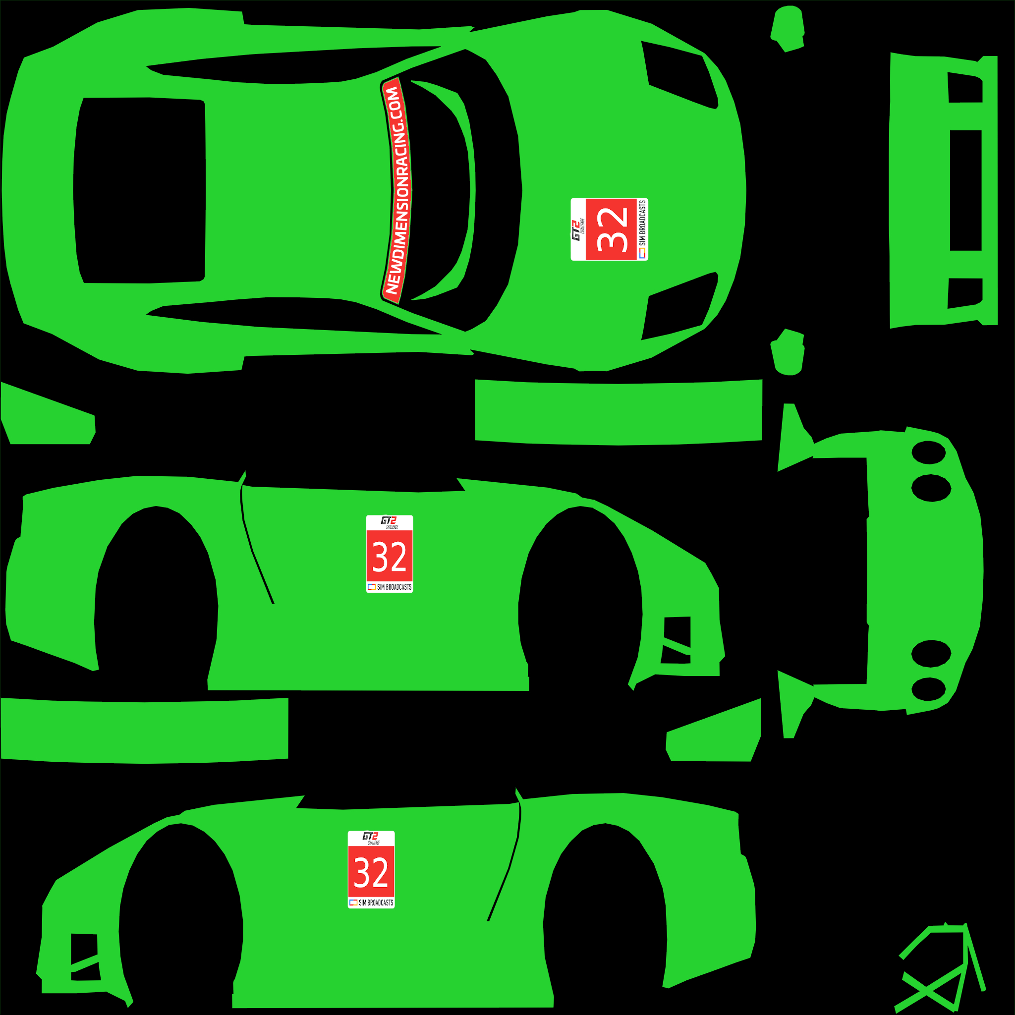 Per the regulations, you are required to run a skin with elements that we provide. For this season, we are providing a sunstrip as an overlay (2048 square), and a numberboard as a PSD file. Please overlay the sunstrip on your livery, and place the numberboard on the following locations:
