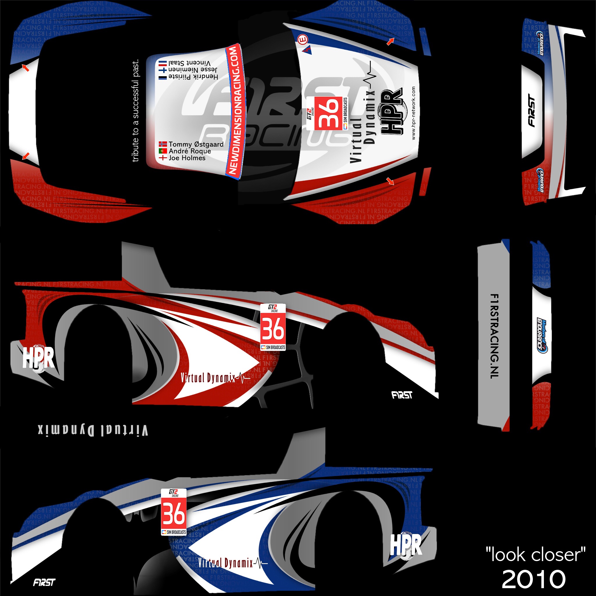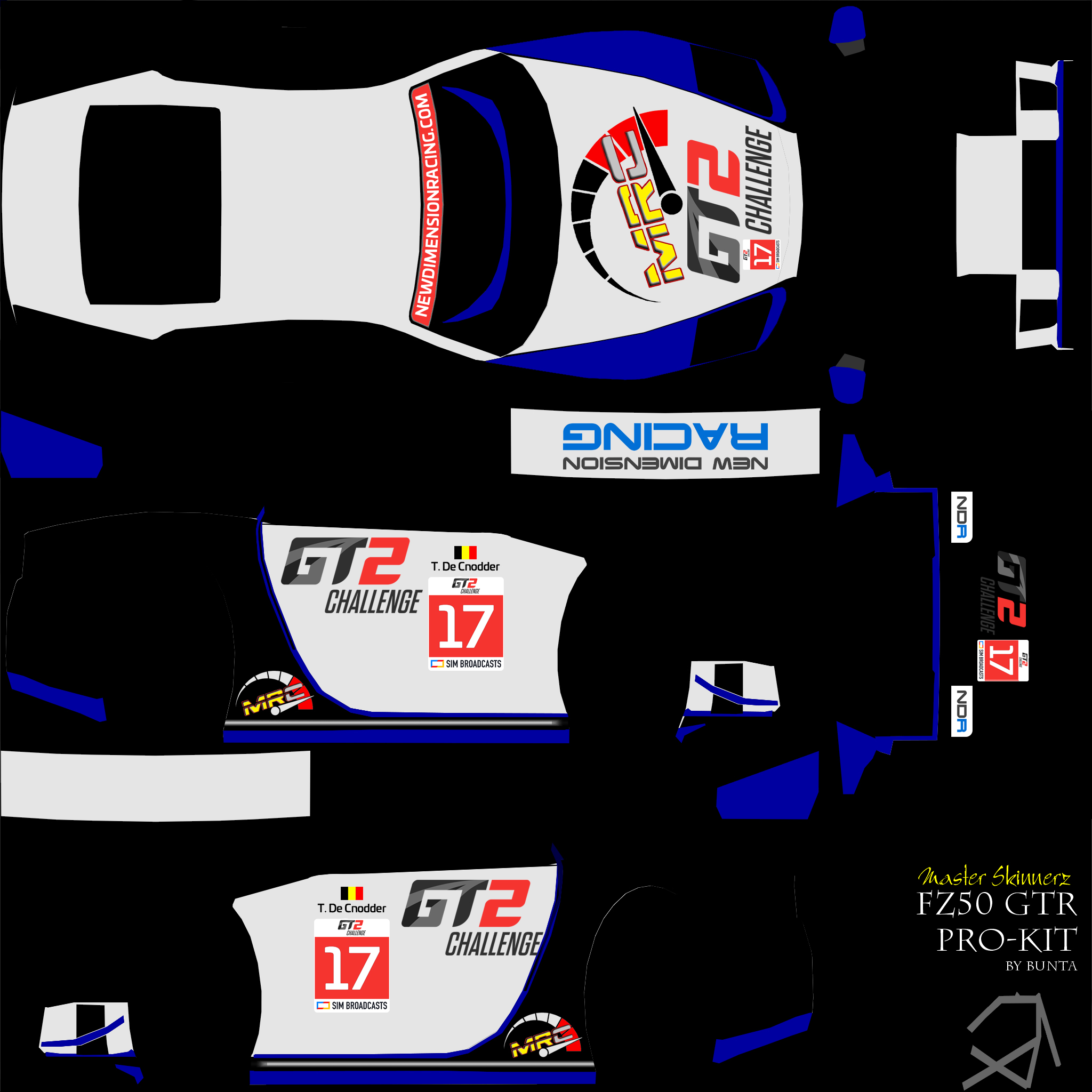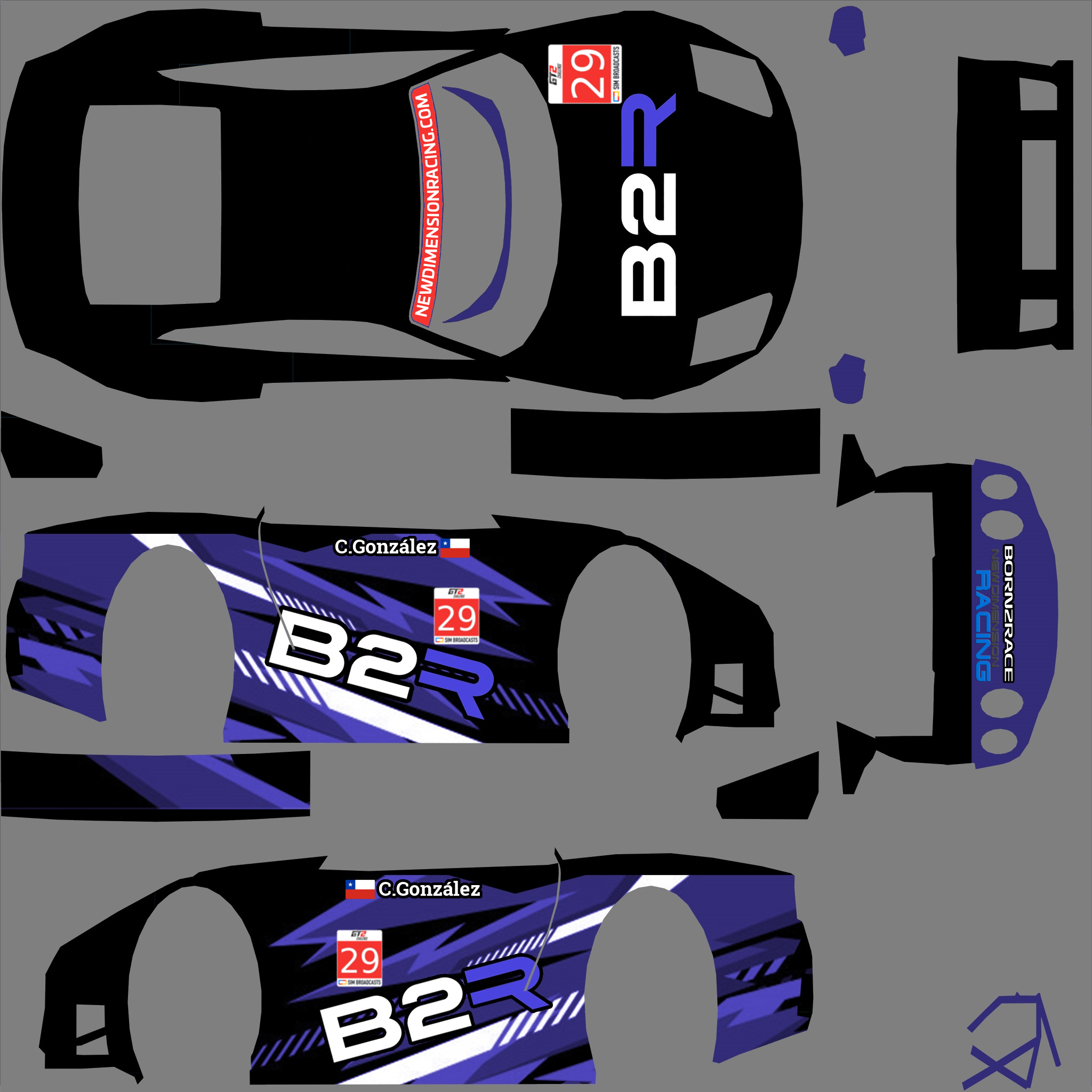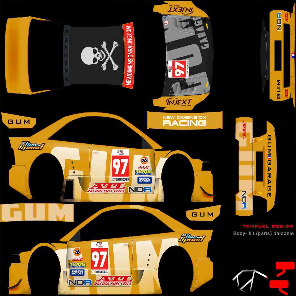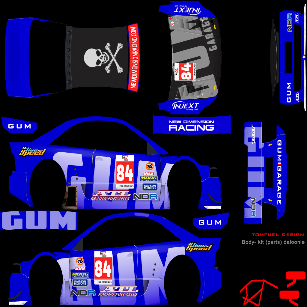 Per the regulations, you are required to run a skin with elements that we provide. For this season, we are providing a sunstrip as an overlay (2048 square), and a numberboard as a PSD file. Please overlay the sunstrip on your livery, and place the numberboard on the following locations: