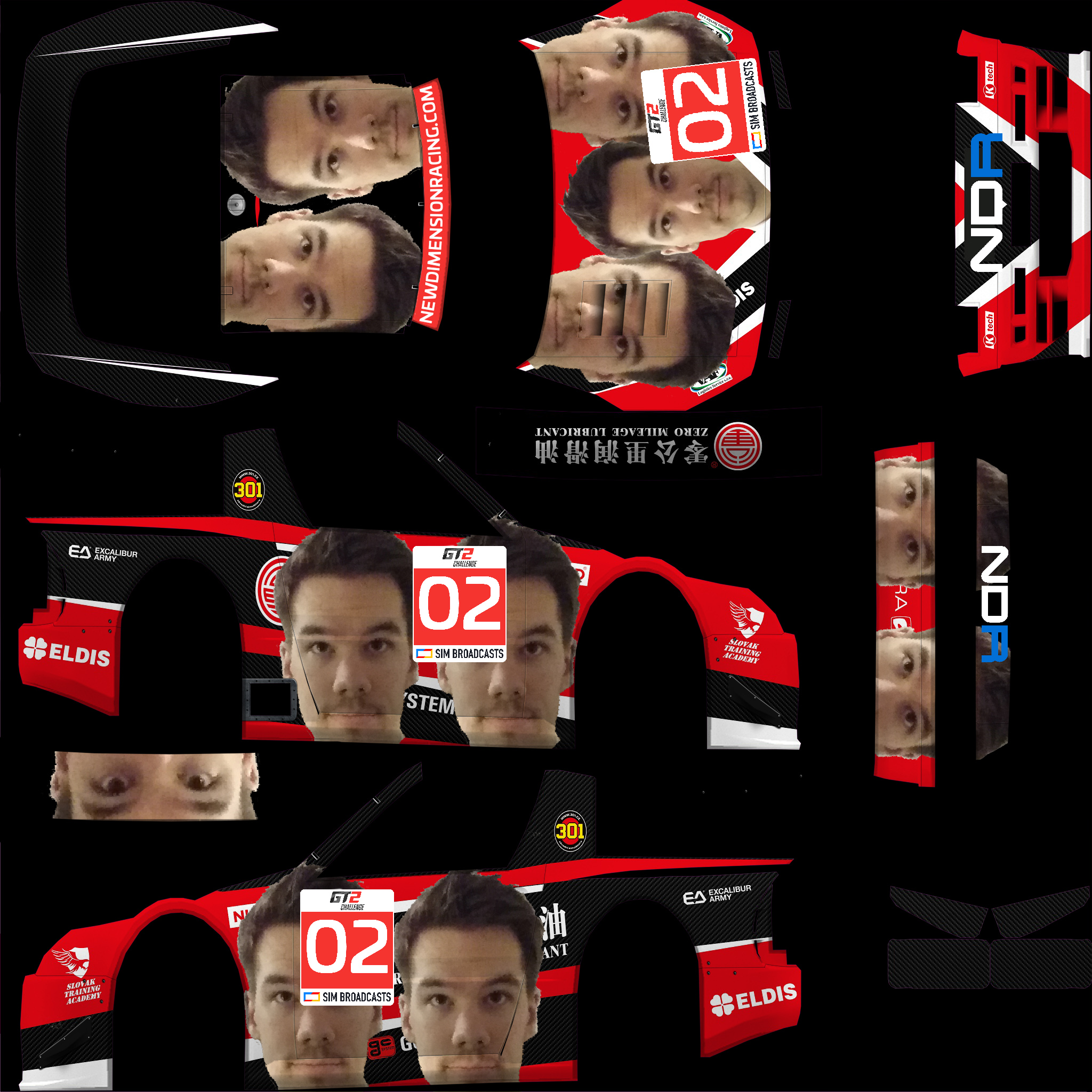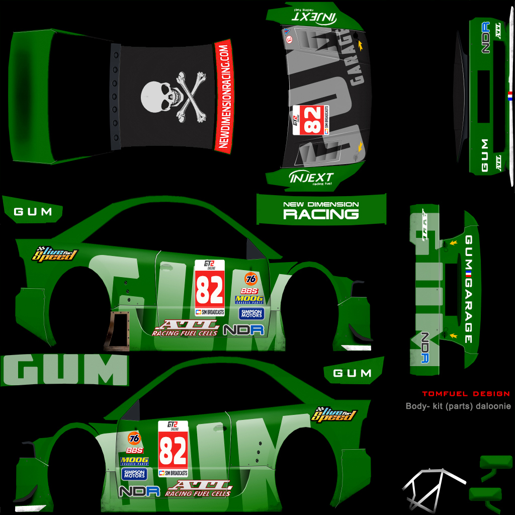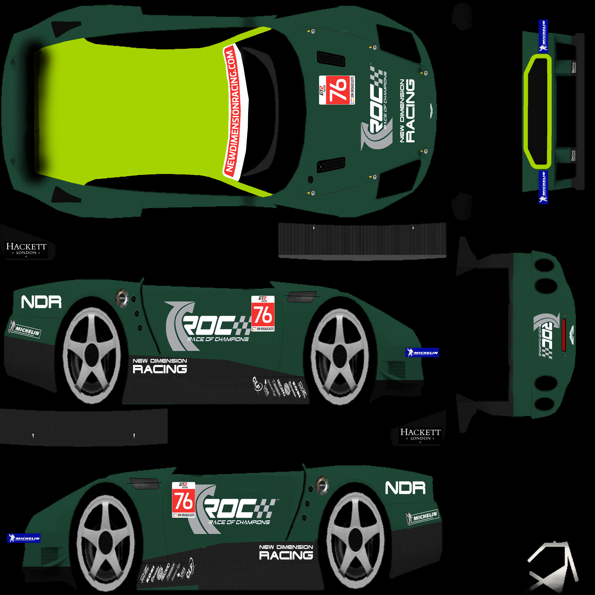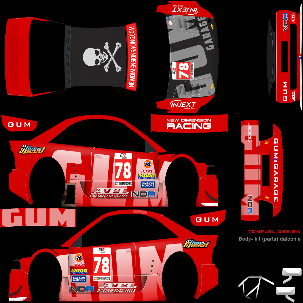 Per the regulations, you are required to run a skin with elements that we provide. For this season, we are providing a sunstrip as an overlay (2048 square), and a numberboard as a PSD file. Please overlay the sunstrip on your livery, and place the numberboard on the following locations: