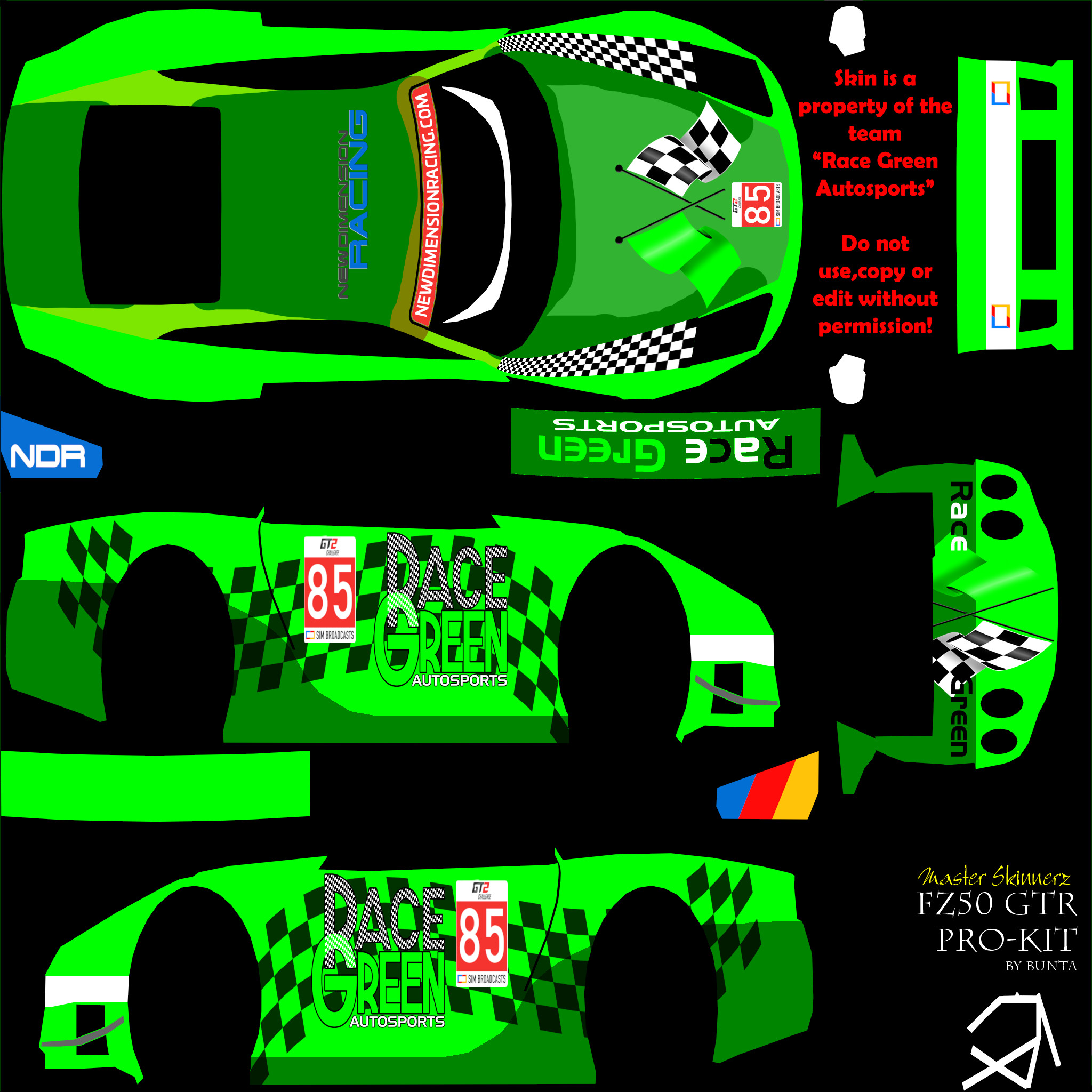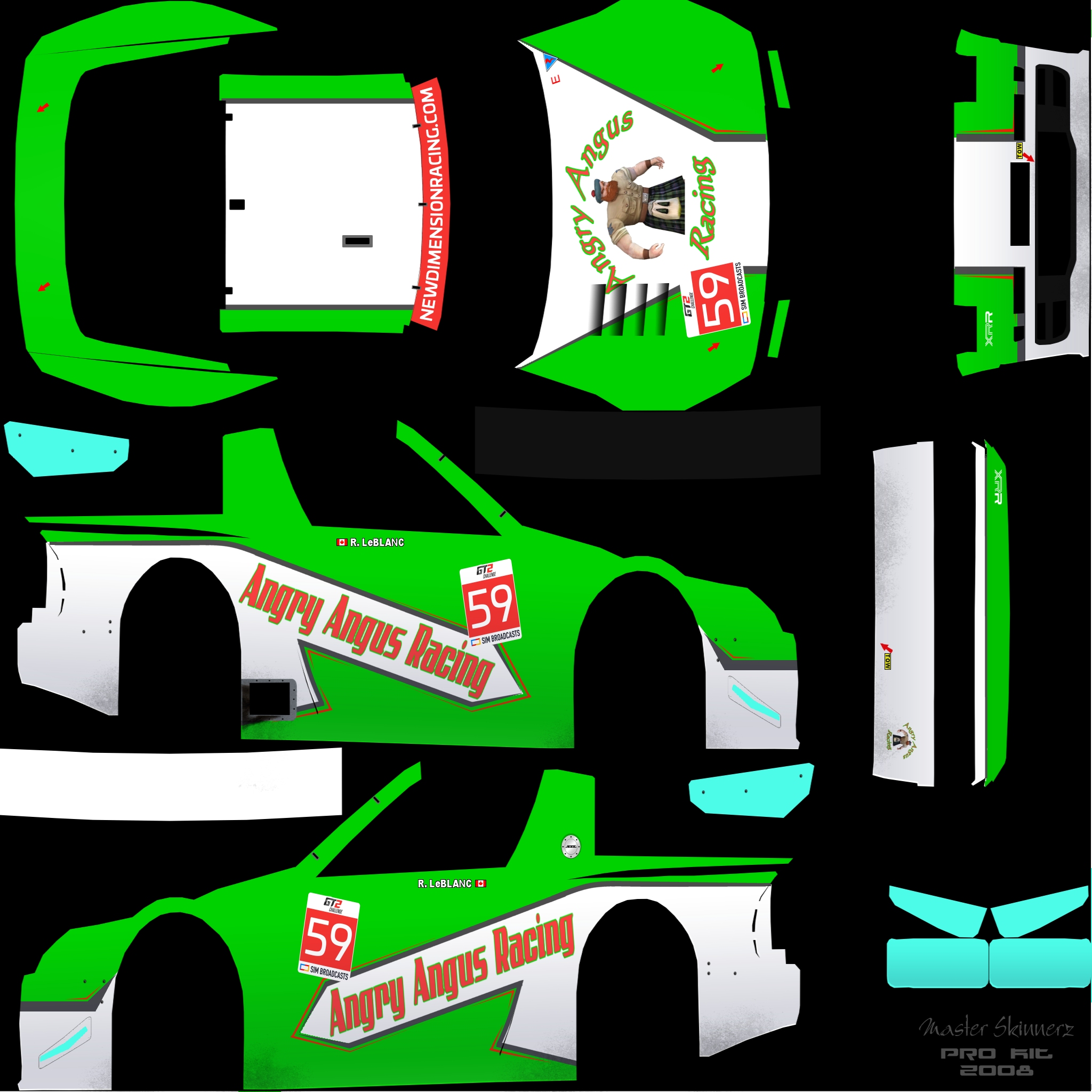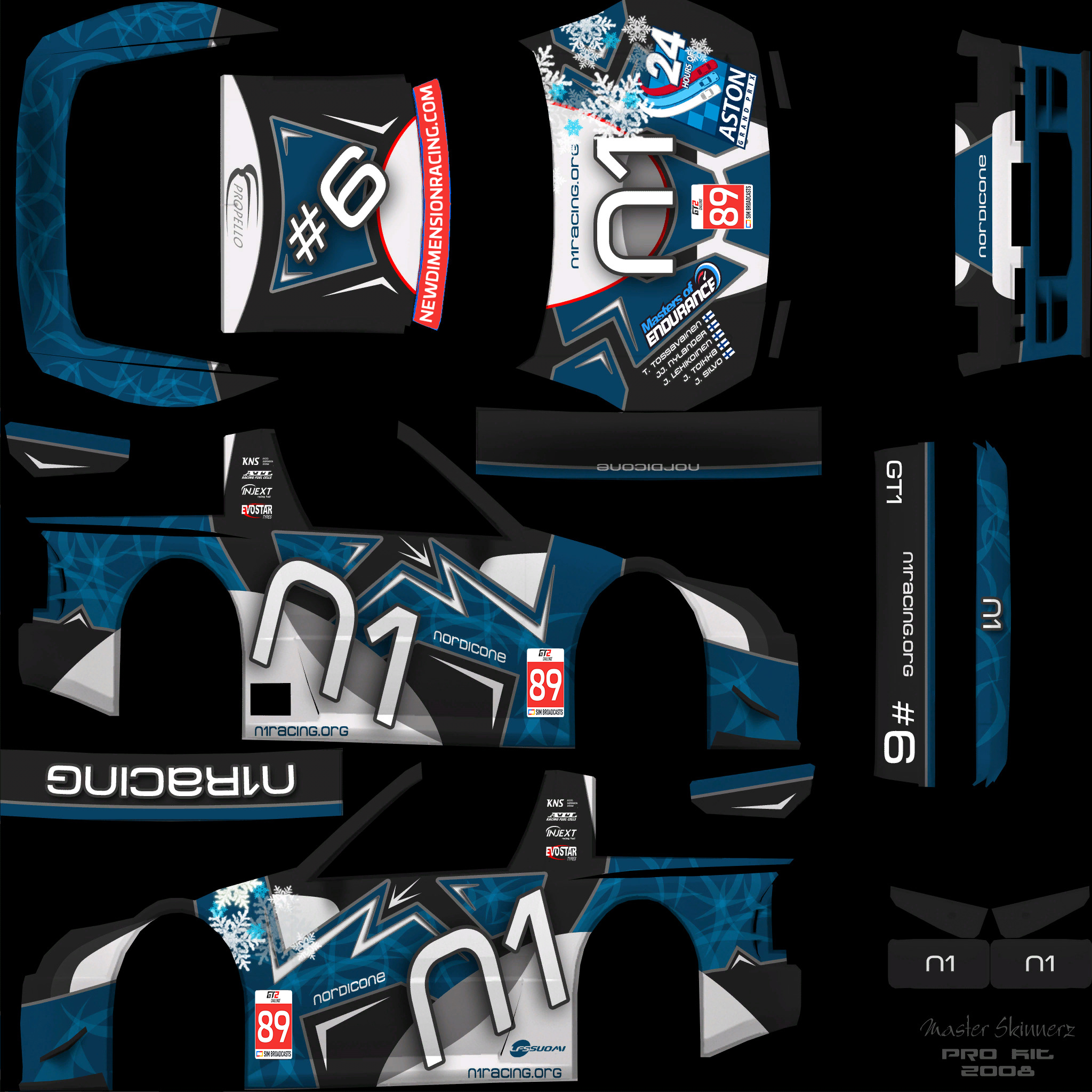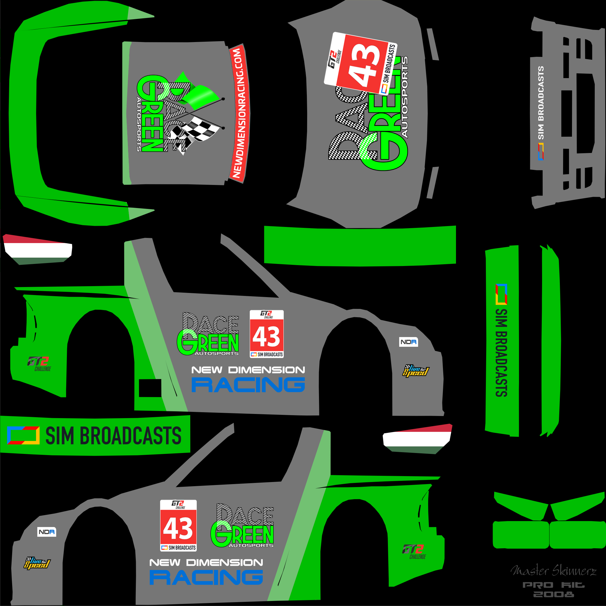 Per the regulations, you are required to run a skin with elements that we provide. For this season, we are providing a sunstrip as an overlay (2048 square), and a numberboard as a PSD file. Please overlay the sunstrip on your livery, and place the numberboard on the following locations: