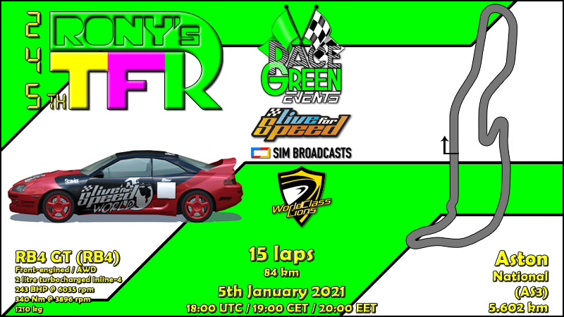 In 2 weeks RTFR will continue with one of the slick tyre cars,more details can be found if carefully watching the stream recording in post above,otherwise full info will be posted as always in weekend before it. Before that next race,RGE will offer another option to race the RB4 - in monday before next RTFR 2nd round of 2021 AWS season will be run at the very short RX loop of Fern Bay RallyX Green - more info in AWS forum section!