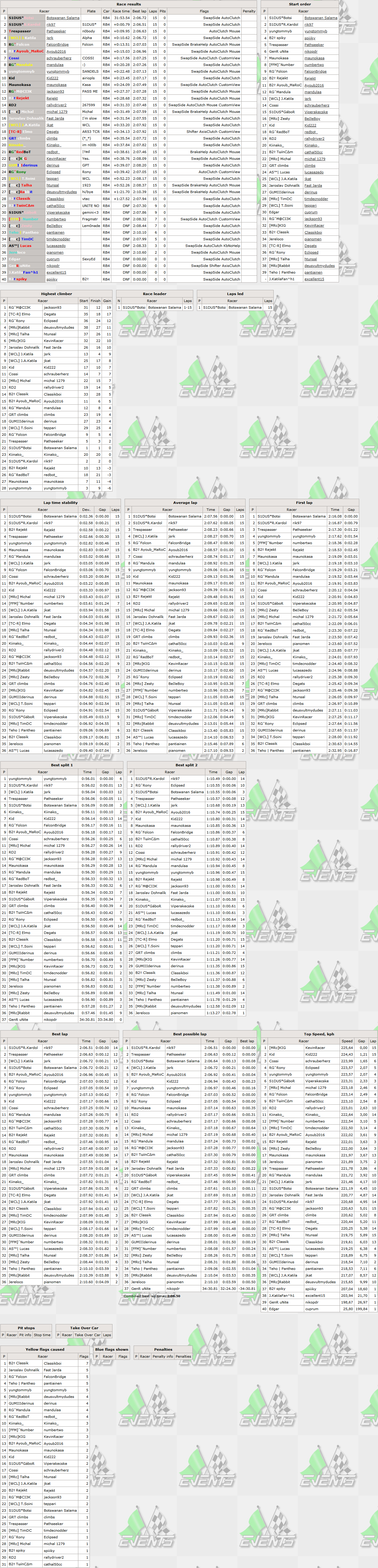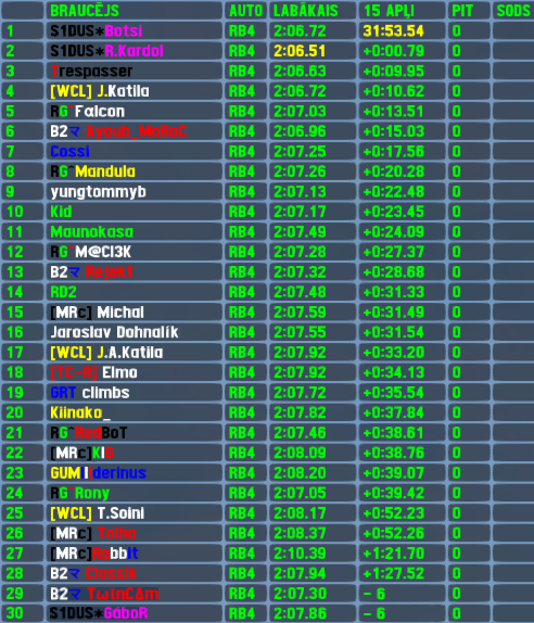 The all-time RTFR most successful driver Botsi started the new year with quite dominant performance by scoring his 30th pole position in RTFR and leading every single meter of yesterday's 15 lap race to score also his 31st racewin and 56th top5 finish. His teammate R.Kardol was following him and despite falling back slightly in middle phase of the race,could still pull back the gap and finish just 0.79 seconds behind winner,which is repeated 23rd closest finish in RTFR history. The dutchman could steal fastest lap of the race during his chase,which is his 3rd and rounded up the count of his RTFR top5 finishes to 30. RTFR newcomer Trespasser advanced 2 positions to finish 3rd almost 10 seconds behind winner,J.Katila advanced even more positions (9) to finish 4th and score his 5th top5 finish,but top5 was completed by Falcon scoring his 37th top5 finish (all time 4th most).