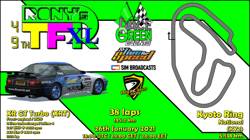 The start of the 2021 RTFR XL year was opened in the Kyoto's "roval" configuration using the classic front engined rear wheel drive sports car XRT. As expected the attendance was increased thanks to SimBroadcasts promotional work,but also full grids were never expected as the combo turned out to be somewhat challenging. Best proof of that is the absence of 4 drivers,who qualified,but never tried to start the race.