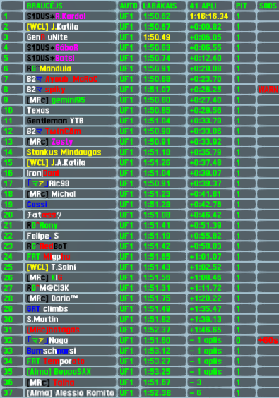 R.Kardol was the one,who chosed this combo and used it for his own good - despite a "tale" through whole race,which occasionally passed him,the dutchman still led 40 of 41 laps on his way to victory lane and became tied 2nd best in all time RTFR XL stats in several positions - this was R.Kardol's 4th race win,4th pole position and 17th top5 finish. It was J.Katila,who was that "tale" - the finn started from 3rd position and chased the leader whole 76 minutes long,stretching his car's nose by for many moments,but never long enough to take over the lead permanently - 2nd place finish,which is his new best finishing position in RTFR XL,4th top5. Unite proved to be fastest during the race,but only for several laps - he improved server's lap record multiple times,but probably his pitstop strategy denied chances to finish higher than 3rd - 6th top5 finish for him and 1st fastest lap of the race. Gábor and Botsi switched positions between start and finish - the hungarian finished 4th and scored his 6th top5 finish while 5th place for Botsi was his 17th top5 finish (the other driver in the 2nd most tie).