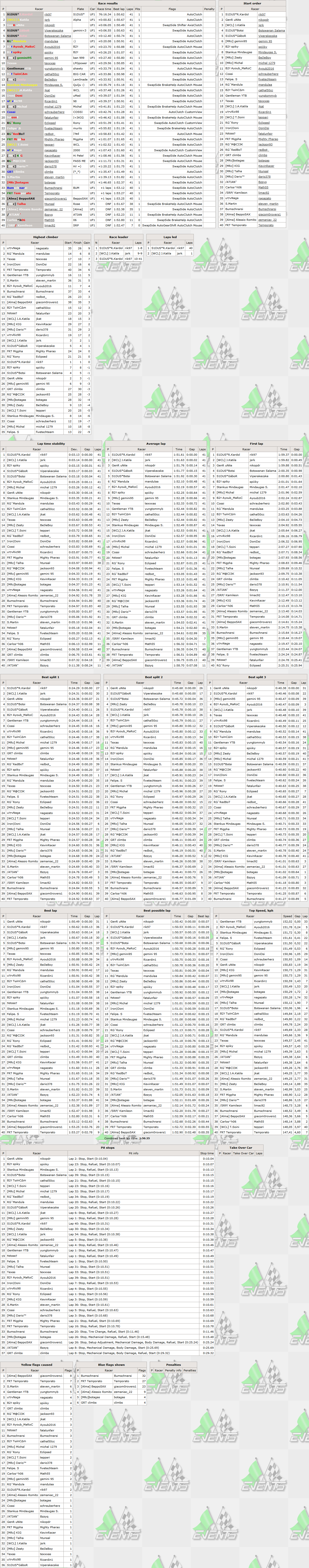 This was the 4th shortest RTFR XL race in terms of race time length - 2 of 3 shorter races were also with UF1,the 3rd - with other STD class car XFG. This of course just proves the fact that slower cars can be raced close to hotlap pace for longer time than faster cars.