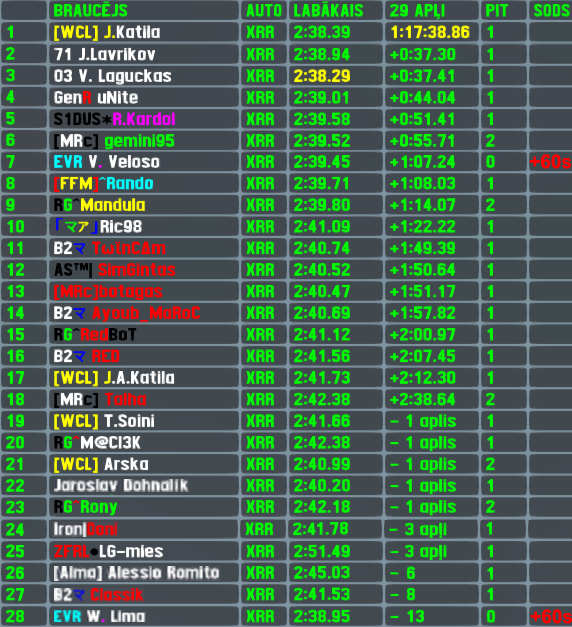 J.Katila set a convincing fastest lap in qualifying securing his 2nd pole position in RTFR XL,led most of the laps on his way to 1st RTFR XL racewin,finishing over half a minute ahead of competition,5th top5 finish in his account,3rd out of 3 this year. J.Lavrikov's only previous attendance to RTFR XL was in the 1st try of this combo,which he won,this year he met stronger competition and barely with some luck could score at least 2nd place finish,2nd top5 for him obviously. J.Laguckas sacrificed his chances for 2nd place by helping J.Lavrikov to finish 2nd,thus finishing 3rd and scoring his 4th top5 finish,but he managed to steal the fastest lap of the race from the winner,which is his 3rd. Unite finished 4th to score his 7th top5 finish in RTFR XL,but the winner of previous 2 races can consider himself lucky to bring home at least 5th place finish,which is his 18th top5 finish - he now breaks the tie and takes a sole 2nd place in most top5 finishes chart.