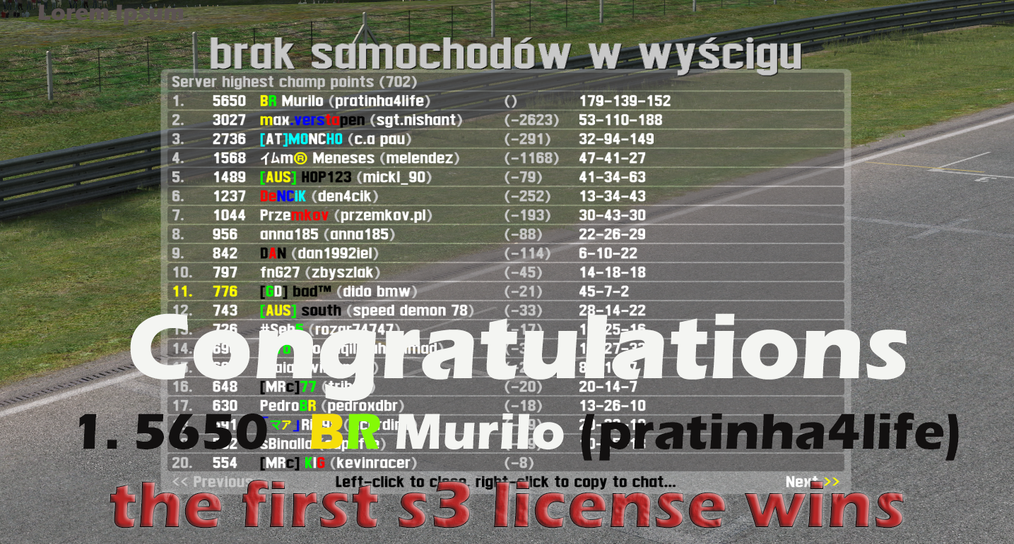 1- Each month, the racer with the most points (first in the list !champ or !ptc) win a S3 license.