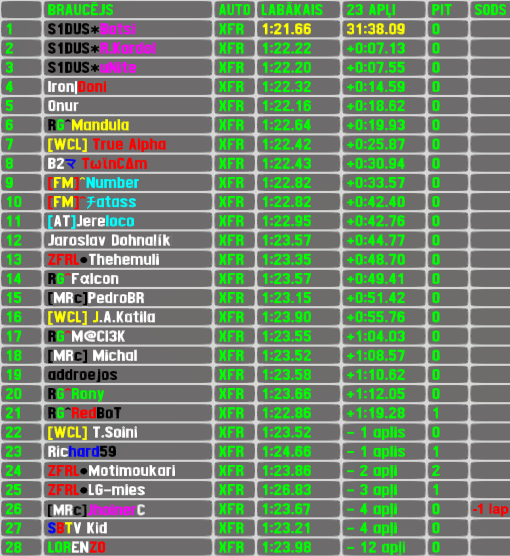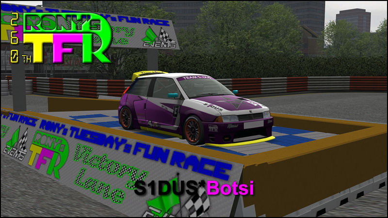 The 3-time XFR race winner Botsi added the 4th win using this car to his achievements,and for the 2nd time had a 2 race winning streak - just like regarding overall wins,where Botsi started his 7th winning streak,which currently is 6th 2-win streak with option to repeat his only 3-win streak. Overall this was Botsi's 34th racewin,33rd pole position,27th fastest lap and 62nd top5 finish. Fight for 2nd position was carried out by both season standings leaders - R.Kardol came on top again and finished 2nd in this race,scoring his 43rd top5 finish,Unite had to concede and finish 3rd,losing few points again - 42nd top5 finish for the finn. Best non-S1dus was Doni in 4th place,which is his best finish of the year and 3rd top5 finish in total,5th place was taken by Onur,who upgraded his previous best finish by 3 positions in his 4th attendance.