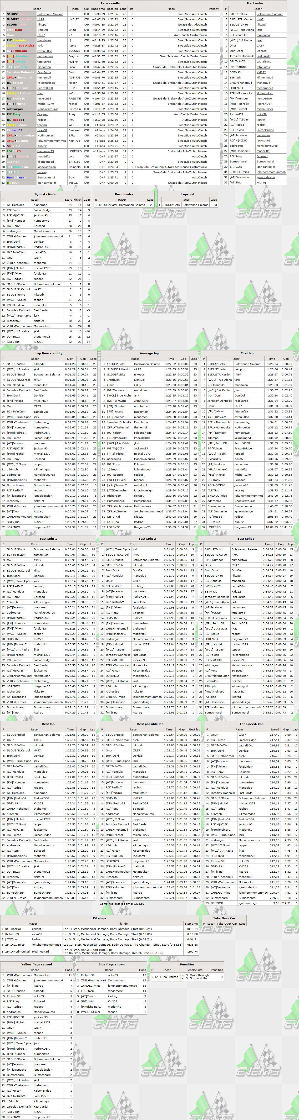 After few more peaceful races regarding post race incidents,this again raised administration's attendion - drivers respectlessly running into group of standing cars with full throttle or searching for Victory lane and attacking race winner. Please stop this behaviour! Firstly for respect reasons,secondary to avoid possible injuries - there are many drivers using high force feedback wheels,where sudden unexpected impact can lead to even injuries! Otherwise the race was hot - both regarding action and fights for positions as also tyre temperatures. But up front we're back to old habbits - one driver dominating without leaving chances to competition.
