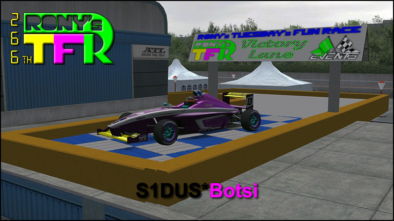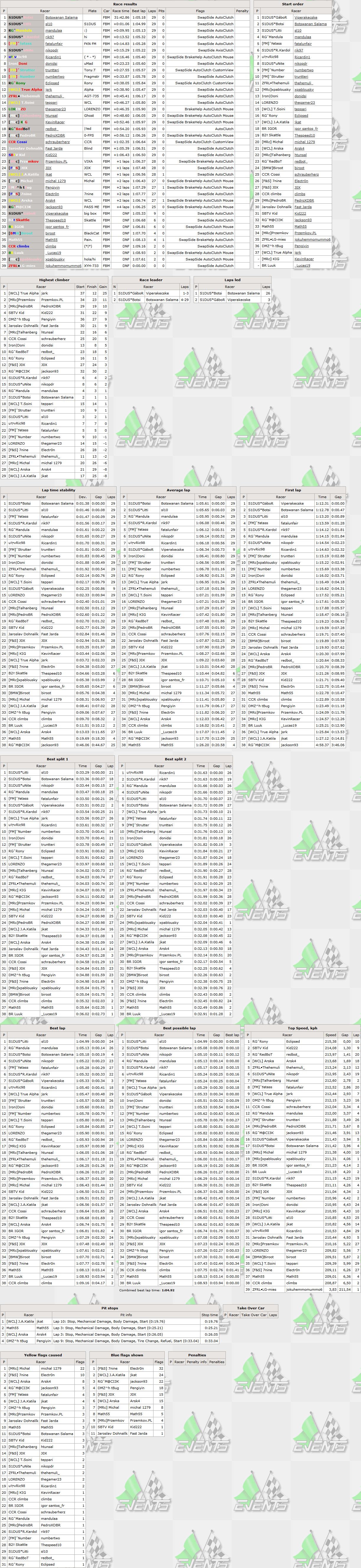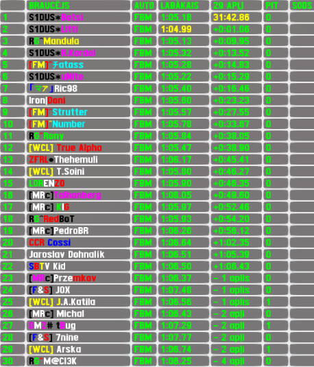 The winningest driver in RTFR history Botsi returned after 5 events break and added another achievement straight away - he started from outside of front row and made a pass for lead after 3 laps of racing. The pass was a bit questionable,but since the "victim" never complained,we can assume it was ok - Botsi led remaining 26 laps and held himself ahead of competition to score his 35th racewin and also his 63rd top5 finish. Litti finished just over a second behind the winner and scored his 12th top5 finish in RTFR,setting also his 9th fastest lap of the race. Mandula was the "best of the rest" by finishing 3rd behind the strong S1dus duo and scored his 21st top5 finish,followed by rating and standings leader R.Kardol,who scored few points gain over his main rival - 4th place for him and the 3-way 47 top5 finishes tie for 3rd most top5 finishes is broken as he alone scored the 48th. Fatass closed up the top5 and added the 3rd top5 finish in his stats.