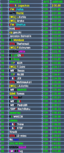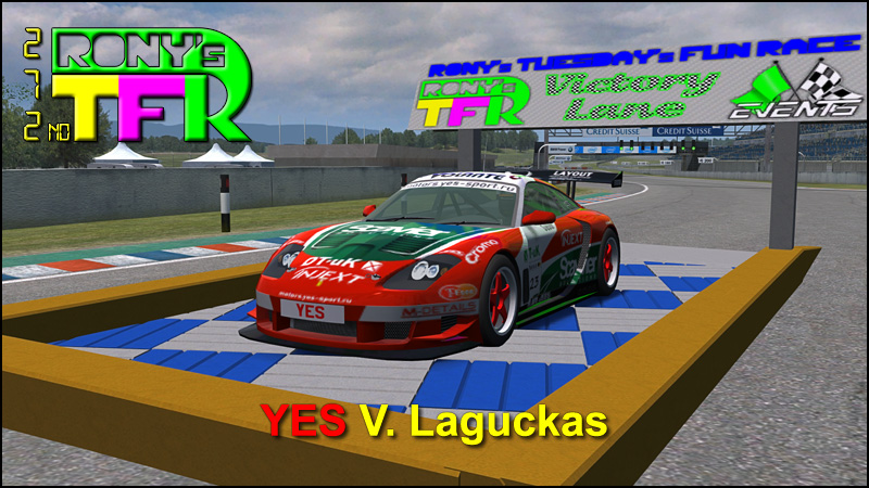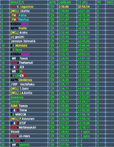 Despite different car,the winner is the same as 2 weeks ago - V.Laguckas had no real competition,setting a laptime more than a second faster than the competition and earning his 7th pole position was just a start. He led every single of 13 race laps and crossed the finish line first,scoring his 4th racewin,setting his 3rd fastest lap of the race during the process,it was also 6th top5 finish for him. Besides that V.Laguckas is the 16th driver to win back to back races in RTFR - in 2 weeks he has a chance to become 6th driver to make a 3 or more win streak. 3rd best driver of last RTFR season J.Katila finished 2nd,advancing 2 positions during the race - 14th top5 finish for him. Fatal repeated his personal best finish - 3rd and scored his 5th top5 finish,but his teammate Ohnifus by finishing 4th improved his personal best result by 3 positions,also his qualifying position 6th was an improvement by 4 positions. Top5 was closed by Unite,who added 52nd top5 finish in his stats and tied R.Kardol for 3rd most top5 finishes.