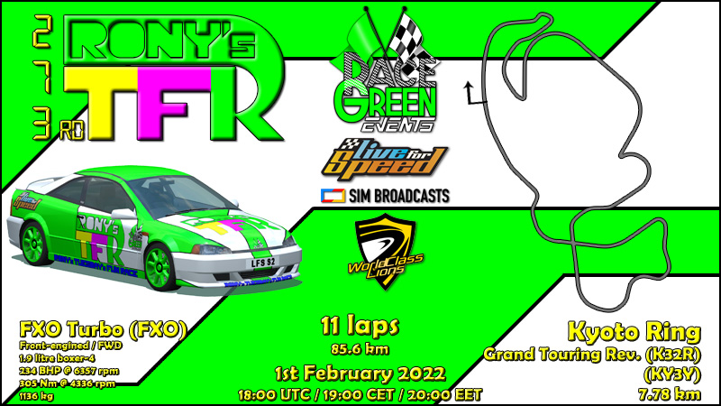 In 2 weeks normal RTFR will return with one of the cars equipped with slick tyres and it is not one of the standard LFS cars,more details as always in the weekend before the event. More details are known about next RTFR XL - laptime testing was started yesterday with the Acosta Starlin in South City's longest standard configuration (join the RTFR server to test yourself),race itself will take place in almost 3 weeks. It's not decided yet if next week there will be one of the experimental RTFR-CCCC races,if so,the info will be posted on sunday.