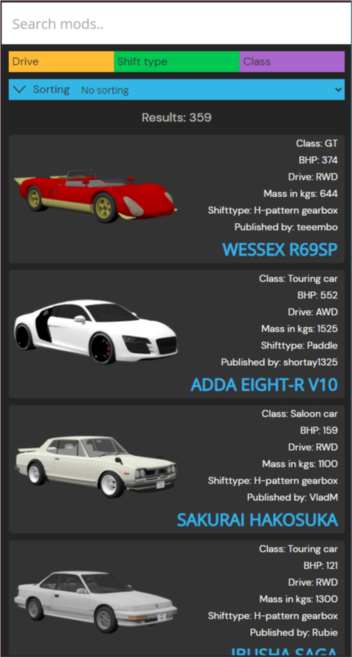 When buying cars on cruise servers, I was spending too much time figuring out what I was buying since there is no images in the insim. So I made something I could use on the phone while driving with wheel and pedals. It has basic functions like search to find images with corresponding mod name. You can click the name and you will be directed to the mod page on LFS. The cool features is the ability to see exactly how many electric vehicles there are, sorted by mass or power. Or if you are looking for the lightest AWD with H-pattern gearbox, boom there it is. Kinda neat imo. Check it out and tell me if you like it. Have a great one =)