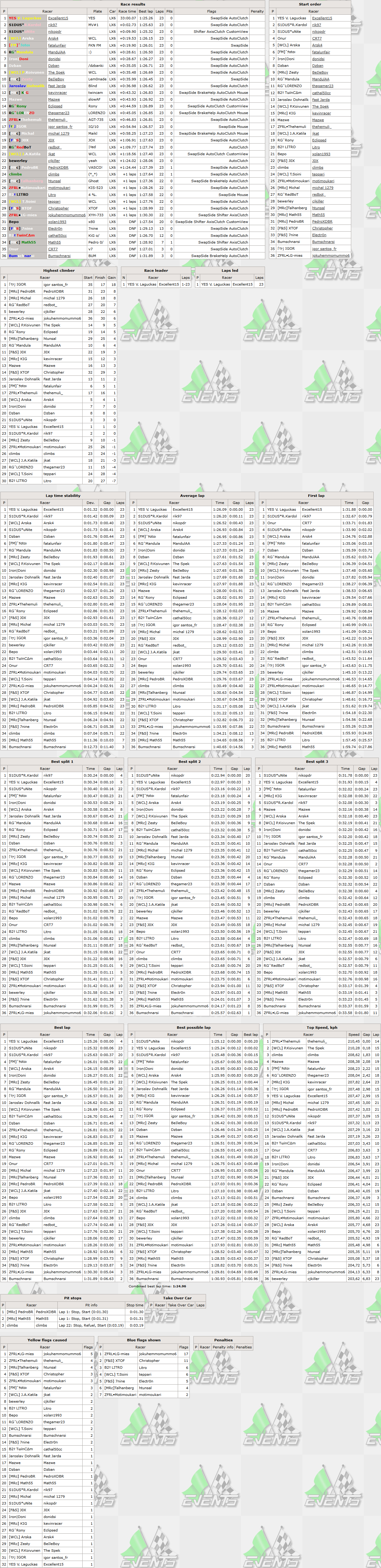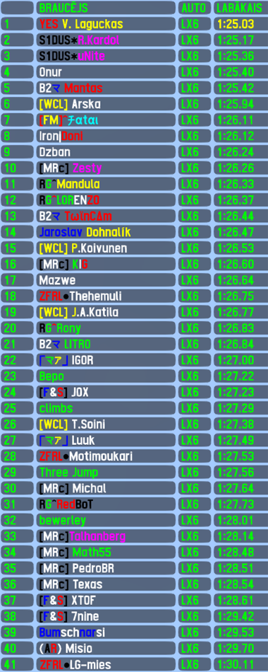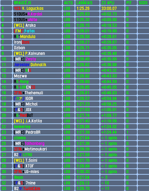 The driver,who has significantly increased his activity this year,was on top of the game also this week - just a day after his AWS round 6 win,V.Laguckas left no real chances to competition also on tuesday,leading all 23 laps of this race and starting his 2nd winning streak in RTFR. The lithuanian might not had dominated this event,but still collected all the big achievements - it was already his 6th racewin,10th pole position (7th driver ever to score 10 or more pole positions in RTFR),4th fastest lap of the race and 9th top5 finish. Last year's best driver R.Kardol was near leader all the time (just 0.14s off pole position and in sight of race leader whole race long),but never had the pace to actually challenge for race win - 55th top5 finish for the dutchman. 2nd best driver of last year was accordingly 3rd best this week - Unite took the last step on the podium and scored his 54th top5 finish. Remaining drivers in top5 were another 2 finns - previous RTFR race winner Arska finished 4th collecting his 15th top5 finish,followed very closely by Fatal,to whom it was 6th top5 finish.