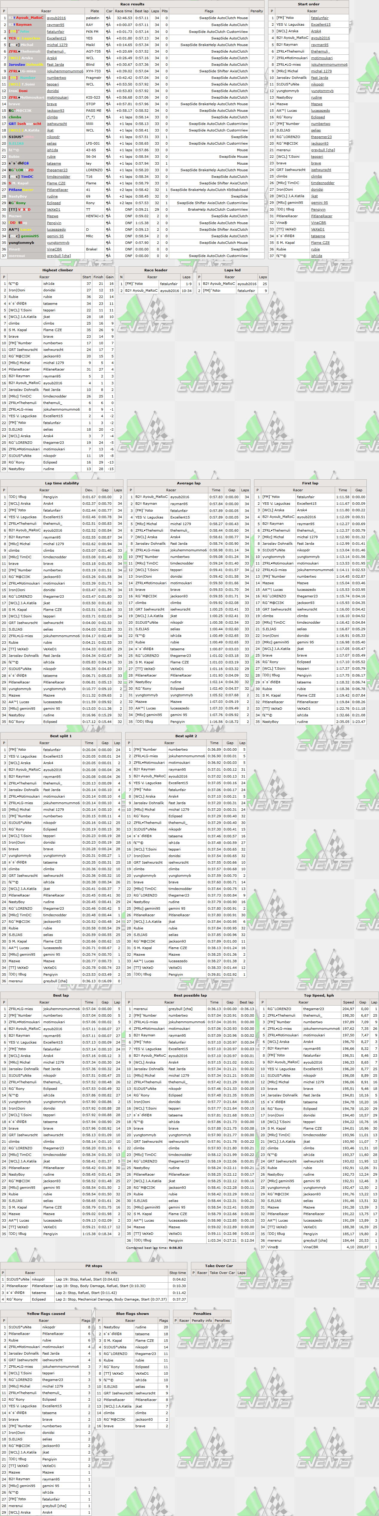 And who was the winner? It was the only known RTFR participant from continent of Africa - the maroccan Ayoub Maroc,adding his country as the 25th in the list of winning nations. He qualified 4th and grouped together with his teammate right from the early race,found the rhythm and eventually passed the front row duo,successfully pulling away from them after that - Ayoub was ahead of the duo all the time and led 25 laps of this race to cross the finish line first. In prevous 24 starts his best finishing result was 3rd,so it's an increase of 2 positions regarding his personal best finish,it was also his 7th top5 finish. Winner's teammate Rayman worked well together,but in the last lap try for win failed the pass for lead and had to settle for 2nd place finish,which is also increase of best finishing result by 2 postions from half as much previous races as his teammate,just 2nd top5 finish for him. Rayman finished just 0.07 seconds behind winner,clocking 8th closest finish in RTFR history. After scoring his 1st ever pole position in qualifying,Fatal was the leader of the leading duo for first 9 laps,but they had to concede to charging B2R teammates - repeat of the best result for the finn,3rd position for the 2nd race in row,8th top5 finish in total. His partner in race was current season leader V.Laguckas,who finished 4th,scoring his 10th top5 finish,6th this year. 5th place was taken by Michal,who also scored his 10th top5 finish. Someone is still missing in this paragraph - the owner of the fastest lap of the race,or what's a bit common in oval racing - owners. LG-mies and Number worked well together in lap 5 to share the fastest lap of the race - first ever for both of them.