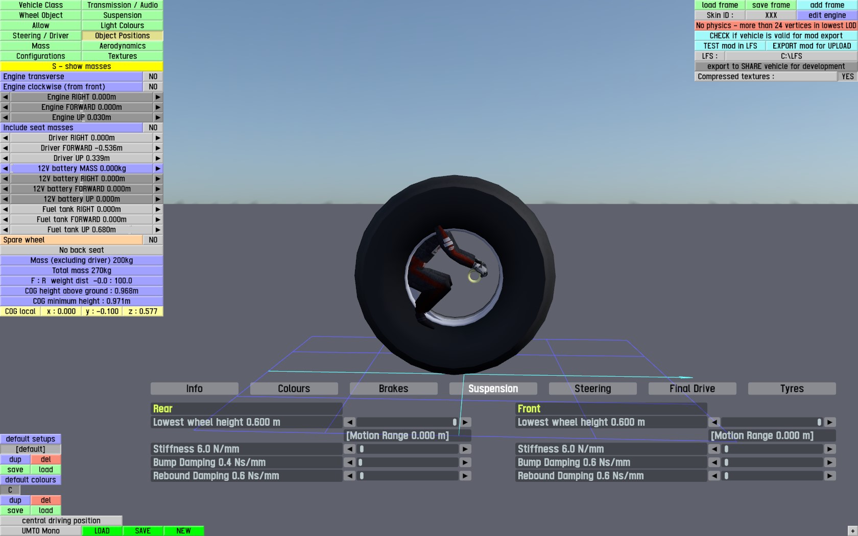 I am attempting to make monocycle ( One-wheel bike, where driver is inside rim ). Seems like LFS doesn't understand this concept, and once off upsidedown, it's physique is lost, despite it is just full wheel around it.
