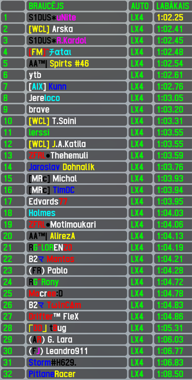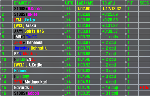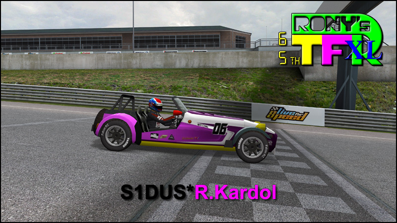 R.Kardol started from the outside of 3 cars wide front row and took the race lead in 2nd lap to set his sights on race win as he was constantly pulling away from competition,giving up his lead only during pitstops phase - on the way to his 8th RTFR XL race win,the dutchman scored also his 7th fastest lap of the race,becoming the sole 2nd position in most fastest laps chart,he also rounded up his top5 count to 30. Despite starting from pole position,Unite did not led a single lap in this race and finished as runner up 25 seconds behind his teammate,still it was his 2nd pole position and 15th top5 finish. Fatal finished 3rd and scored his 4th top5 finish this year in 5 races,5th top5 overall. The only other laps leader Arska finished 4th,losing 2 positions between start and finish,that's his 6th top5 finish and best result of this year,he also becomes 48th driver to lead a lap in RTFR XL history. Top5 was closed by Spirts,who started his 2nd race in the series and greatly improved his previous best finish 11th.
