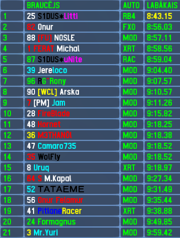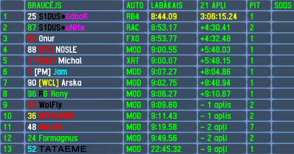 Their teammate Unite entered this event for the first time under name Saab and finished 2nd,repeating RAC's success from last year. Despite 2 pitstops he finished just 2 seconds ahead of closest rival Atmaca,run by Onur with FXO - the winning car of 2020 was not entered last year,but returned on podium right on return. Best of the non-standard LFS cars finished 4th,unsurprisingly it was the most popular car in the event - Acosta Starlin,run by FU Racing and their driver Nosle. Last year's winner Ferat Motors finished 5th,Michal was running XRT for the 3rd year in row.