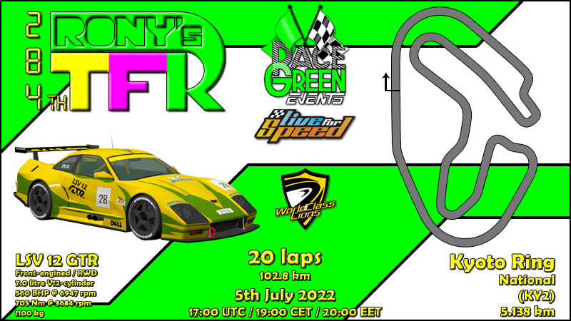 Next week we'll return to LFS standard GTR cars - in the next RTFR XL is the FZR on the line to be raced in the other standard Kyoto road course config Kyoto GP Long,using the Boothy chicane adjustment on the fast chicane leading off the oval part. Full info will be posted and server will be set up tomorrow. But in 2 weeks in next normal RTFR it will be one of the street legal cars on the line again. With this the activity from RGE does not end this week,but the next event won't be using a 4-wheeled vehicle like all our previous events before - this sunday we will host our first ever motorcycle event,which will be run in time trial format. More info you can find out in the Race Green Westhill Tourist Trophy thread.